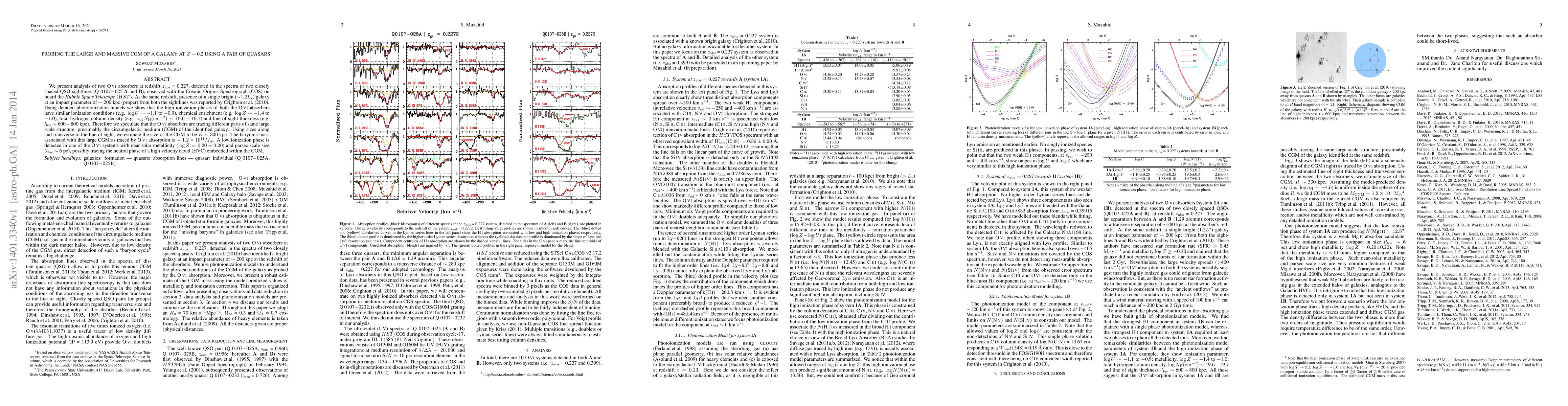We present analysis of two O VI absorbers at redshift z_{abs} = 0.227, detected in the spectra of two closely spaced QSO sightlines (Q 0107-025 A and B), observed with the Cosmic Origins Spectrograph (COS) on board the Hubble Space Telescope (HST). At the same redshift, presence of a single bright (~ 1.2 L*) galaxy at an impact parameter of ~ 200 kpc (proper) from both the sightlines was reported by Crighton et al. (2010). Using detailed photoionization models we show that the high ionization phases of both the O VI absorbers have similar ionization conditions (e.g. log U ~ -1.1 to -0.9), chemical enrichment (e.g. log Z ~ -1.4 to -1.0), total hydrogen column density (e.g. log N_{H} (cm^{-2}) ~ 19.6-19.7) and line of sight thickness (e.g. l_{los} ~ 600-800 kpc). Therefore we speculate that the O VI absorbers are tracing different parts of same large scale structure, presumably the circumgalactic medium (CGM) of the identified galaxy. Using sizes along and transverse to the line of sight, we estimate the size of the CGM to be R ~ 330 kpc. The baryonic mass associated with this large CGM as traced by O VI absorption is ~ 1.2x10^{11} M_{sun}. A low ionization phase is detected in one of the O VI systems with near solar metallicity (log Z = 0.20\pm0.20) and parsec scale size (l_{los} ~ 6 pc), possibly tracing the neutral phase of a high velocity cloud (HVC) embedded within the CGM.