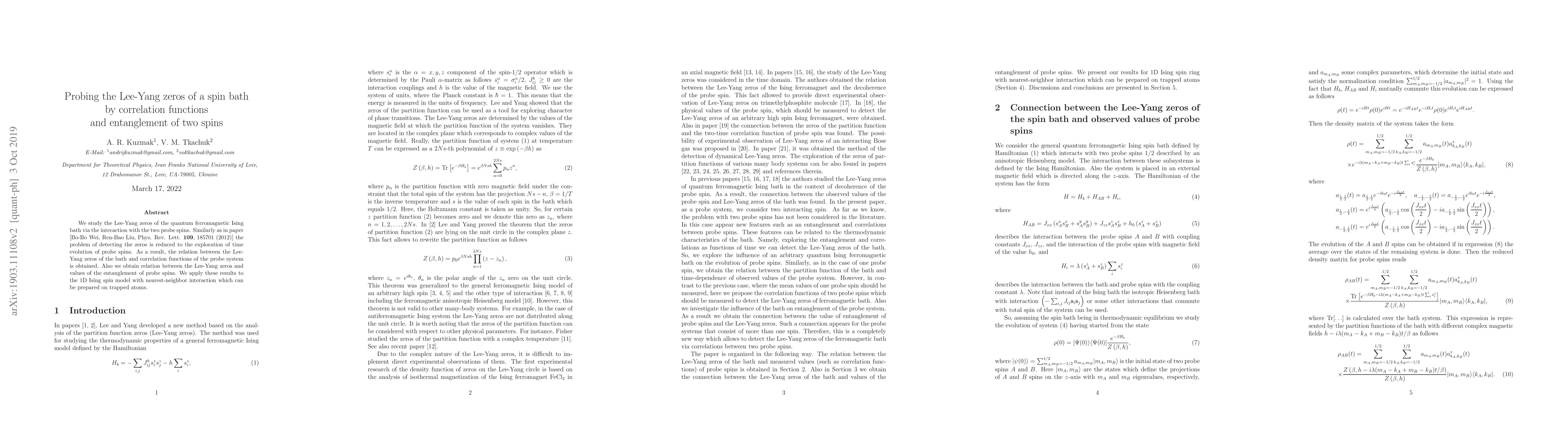 We study the Lee-Yang zeros of the ferromagnetic Ising bath via the interaction with the two probe spins. Similarly as in paper [Bo-Bo Wei, Ren-Bao Liu, Phys. Rev. Lett. 109, 185701 (2012)] the problem of detecting the zeros is reduced to the exploration of time evolution of probe spins. As a result, the relation between the Lee-Yang zeros of the bath and correlation functions of the probe system is obtained. Also we obtain relation between the Lee-Yang zeros and values of the entanglement of probe spins. We apply these results to the 1D Ising spin model with nearest-neighbor interaction which can be prepared on trapped atoms.