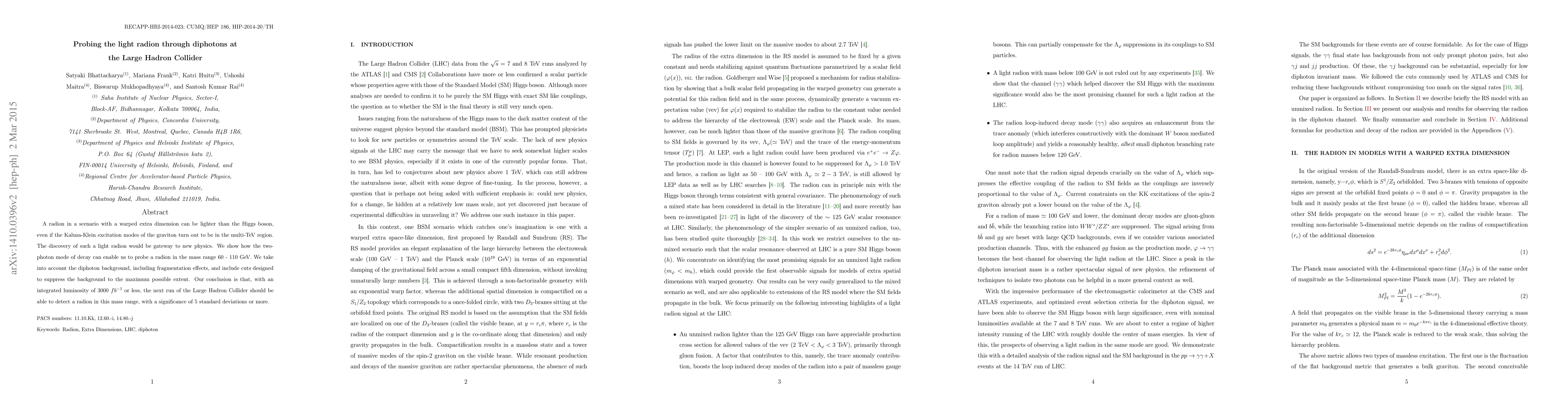A radion in a scenario with a warped extra dimension can be lighter than the Higgs boson, even if the Kaluza-Klein excitation modes of the graviton turn out to be in the multi-TeV region. The discovery of such a light radion would be gateway to new physics. We show how the two-photon mode of decay can enable us to probe a radion in the mass range 60 - 110 GeV. We take into account the diphoton background, including fragmentation effects, and include cuts designed to suppress the background to the maximum possible extent. Our conclusion is that, with an integrated luminosity of 3000 $\rm fb^{-1}$ or less, the next run of the Large Hadron Collider should be able to detect a radion in this mass range, with a significance of 5 standard deviations or more.