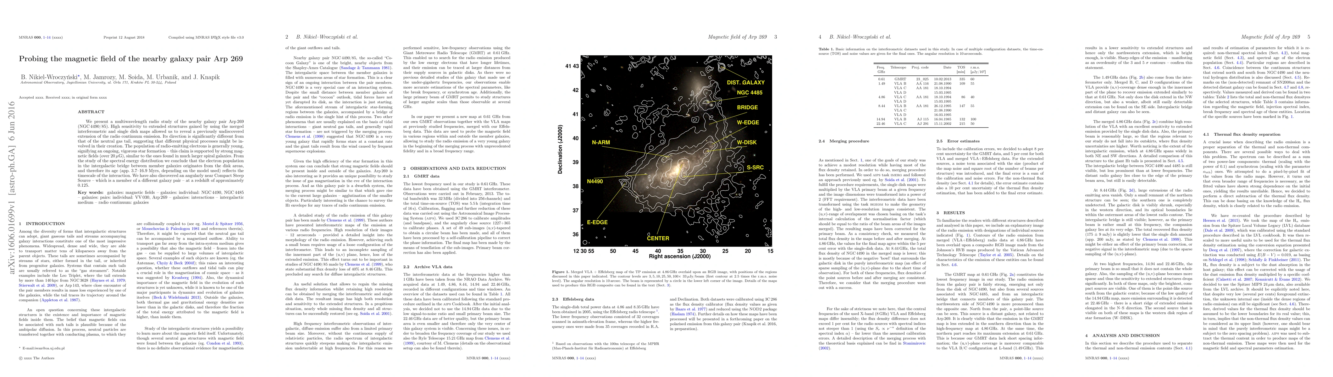 We present a multiwavelength radio study of the nearby galaxy pair Arp 269 (NGC 4490/85). High sensitivity to extended structures gained by using the merged interferometric and single- dish maps allowed us to reveal a previously undiscovered extension of the radio continuum emission. Its direction is significantly different from that of the neutral gas tail, suggesting that different physical processes might be involved in their creation. The population of radio- emitting electrons is generally young, signifying an ongoing, vigorous star formation -- this claim is supported by strong magnetic fields (over 20 {\mu}G), similar to the ones found in much larger spiral galaxies. From the study of the spectral energy distribution, we conclude that the electron population in the intergalactic bridge between member galaxies originates from the disc areas, and therefore its age (approximately 3.7--16.9 Myr, depending on the model used) reflects the time-scale of the interaction. We have also discovered an angularly near compact steep source -- which is a member of a different galaxy pair -- at a redshift of approximately 0.125.