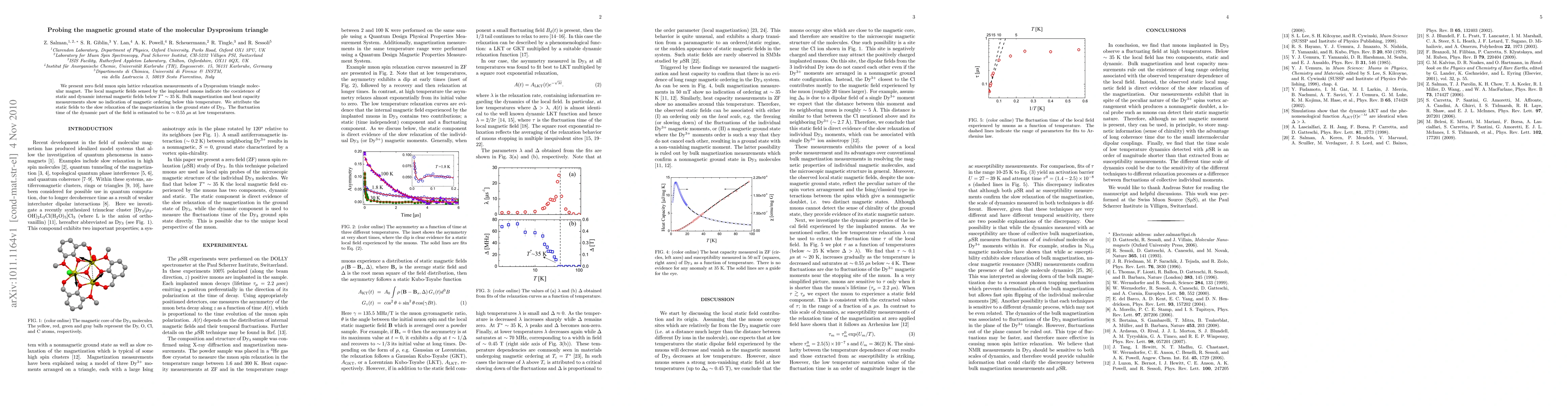 We present zero field muon spin lattice relaxation measurements of a Dysprosium triangle molecular magnet. The local magnetic fields sensed by the implanted muons indicate the coexistence of static and dynamic internal magnetic fields below $T^* ~35$ K. Bulk magnetization and heat capacity measurements show no indication of magnetic ordering below this temperature. We attribute the static fields to the slow relaxation of the magnetization in the ground state of Dy3. The fluctuation time of the dynamic part of the field is estimated to be ~0.55 $\mu$s at low temperatures