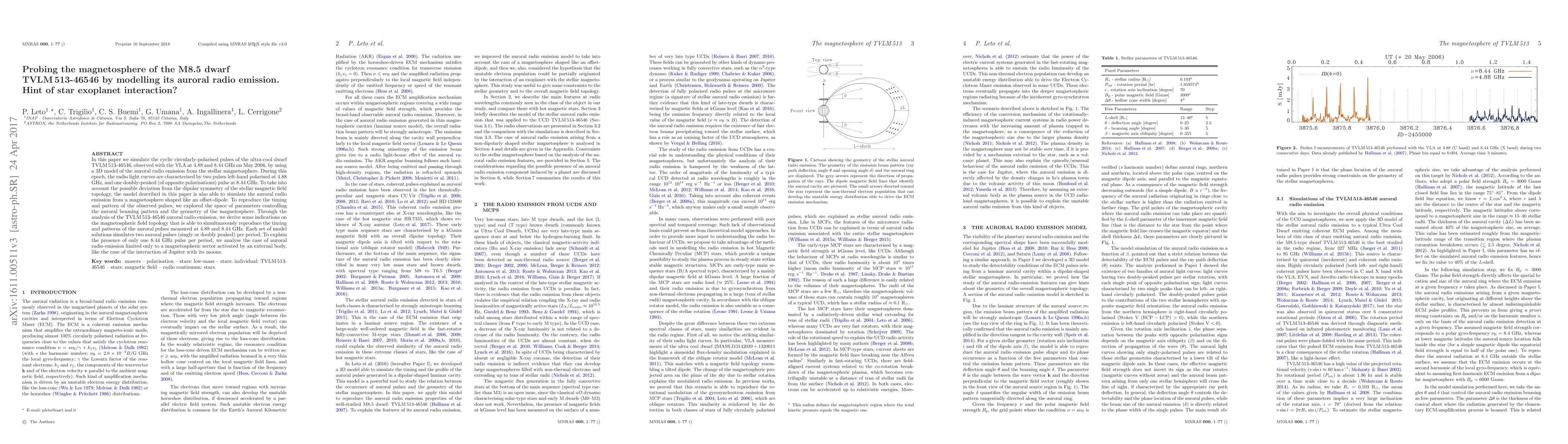 This paper models the auroral radio emission of the ultra-cool dwarf TVLM513-46546 to probe its magnetosphere, finding two left-hand polarised pulses at 4.88 GHz and one doubly-peaked pulse at 8.44 GHz. The study suggests an offset-dipole magnetic field topology and explores interactions akin to Jupiter's moons to explain the observed pulse patterns.