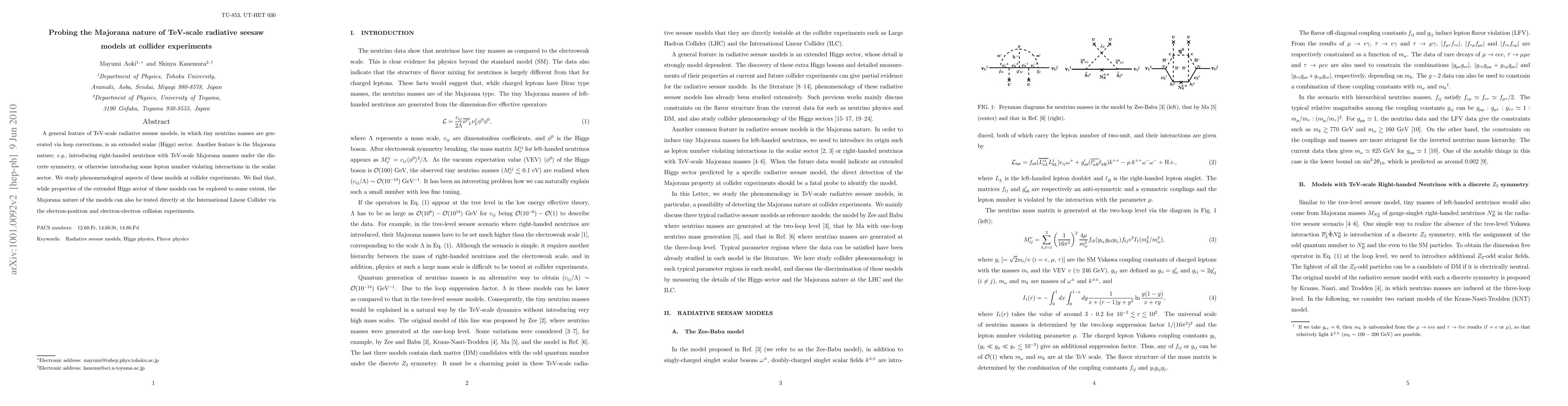 This paper investigates the phenomenological implications of TeV-scale radiative seesaw models at collider experiments, focusing on the extended scalar sector and Majorana nature. The study finds that while the Higgs sector can be explored, the Majorana nature can be directly tested via electron-positron and electron-electron collisions at the International Linear Collider.