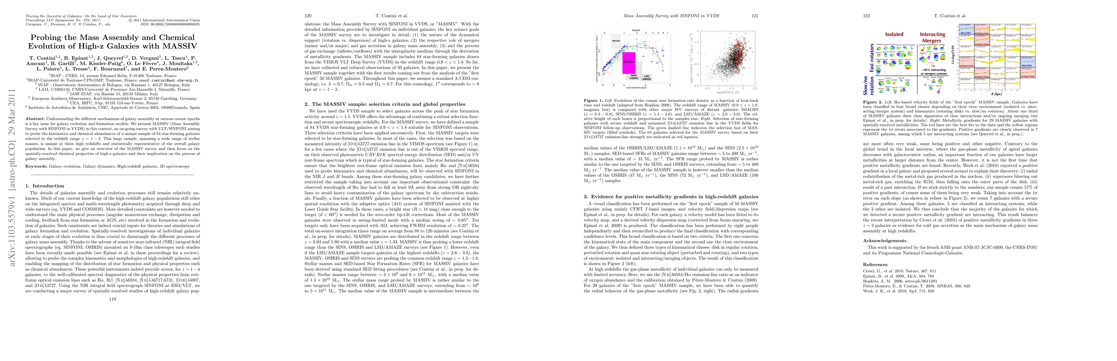 This paper introduces the MASSIV survey, which uses VLT/SINFONI to study the kinematics and chemical abundances of 84 high-z galaxies (z ~ 1-2). The survey aims to understand galaxy assembly mechanisms and provides insights into the spatially-resolved chemical evolution of these galaxies.