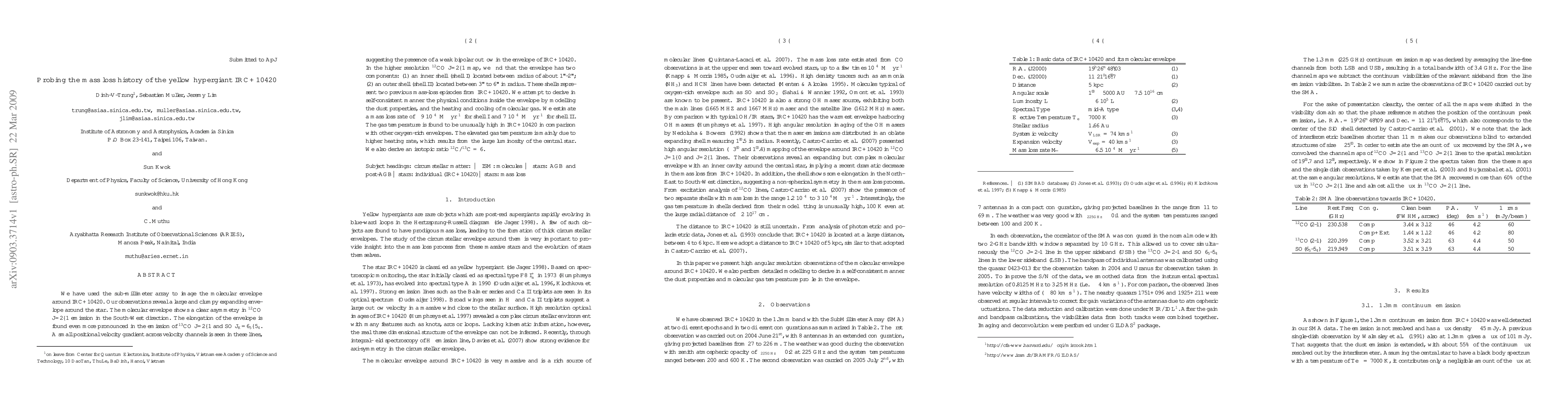 Astronomers used a sub-millimeter array to study the molecular envelope of IRC+10420, finding two distinct mass loss episodes with high gas temperatures, and evidence for a weak bipolar outflow.