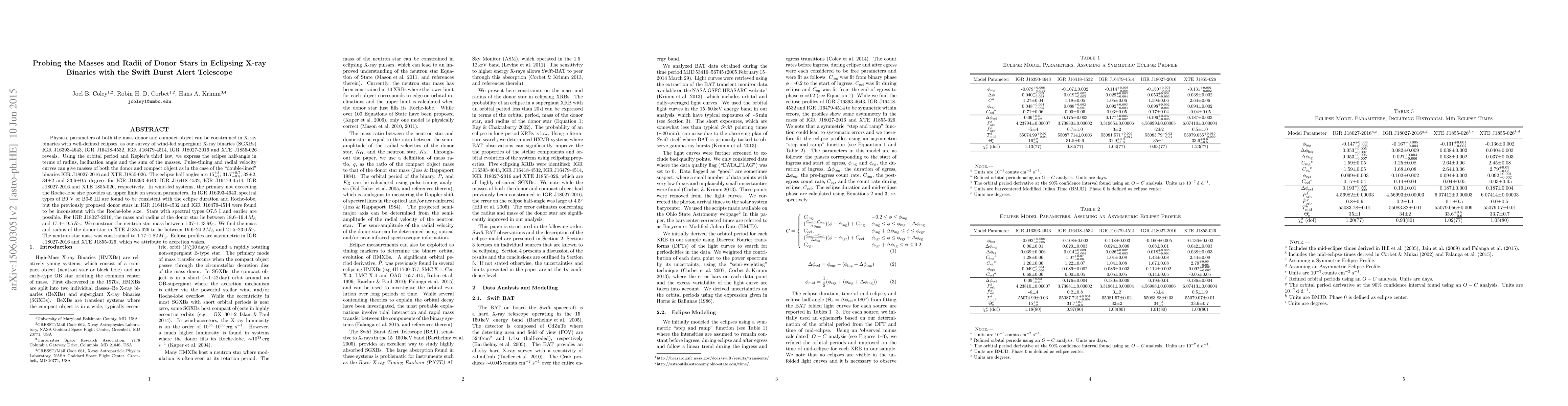 Physical parameters of both the mass donor and compact object can be constrained in X-ray binaries with well-defined eclipses, as our survey of wind-fed supergiant X-ray binaries (SGXBs) IGR J16393-4643, IGR J16418-4532, IGR J16479-4514, IGR J18027-2016 and XTE J1855-026 reveals. Using the orbital period and Kepler's third law, we express the eclipse half-angle in terms of radius, inclination angle and the sum of the masses. Pulse-timing and radial velocity curves can give masses of both the donor and compact object as in the case of the "double-lined" binaries IGR J18027-2016 and XTE J1855-026. The eclipse half angles are 15 (+3,-2), 31.7 (+0.7,-0.8), 32 +/- 2, 34 +/- 2 and 33.6 +/- 0.7 degrees for IGR J16393-4643, IGR J16418-4532, IGR J16479-4514, IGR J18027-2016 and XTE 1855-026, respectively. In wind-fed systems, the primary not exceeding the Roche-lobe size provides an upper limit on system parameters. In IGR J16393-4643, spectral types of B0 V or B0-5 III are found to be consistent with the eclipse duration and Roche-lobe, but the previously proposed donor stars in IGR J16418-4532 and IGR J16479-4514 were found to be inconsistent with the Roche-lobe size. Stars with spectral types O7.5 I and earlier are possible. For IGR J18027-2016, the mass and radius of the donor star lie between 18.6--19.4 $M_\odot$ and 17.4--19.5 $R_\odot$. We constrain the neutron star mass between 1.37--1.43 $M_\odot$. We find the mass and radius of the donor star in XTE J1855-026 to lie between 19.6--20.2 $M_\odot$ and 21.5--23.0 $R_\odot$. The neutron star mass was constrained to 1.77--1.82 $M_\odot$. Eclipse profiles are asymmetric in IGR J18027-2016 and XTE J1855-026, which we attribute to accretion wakes.