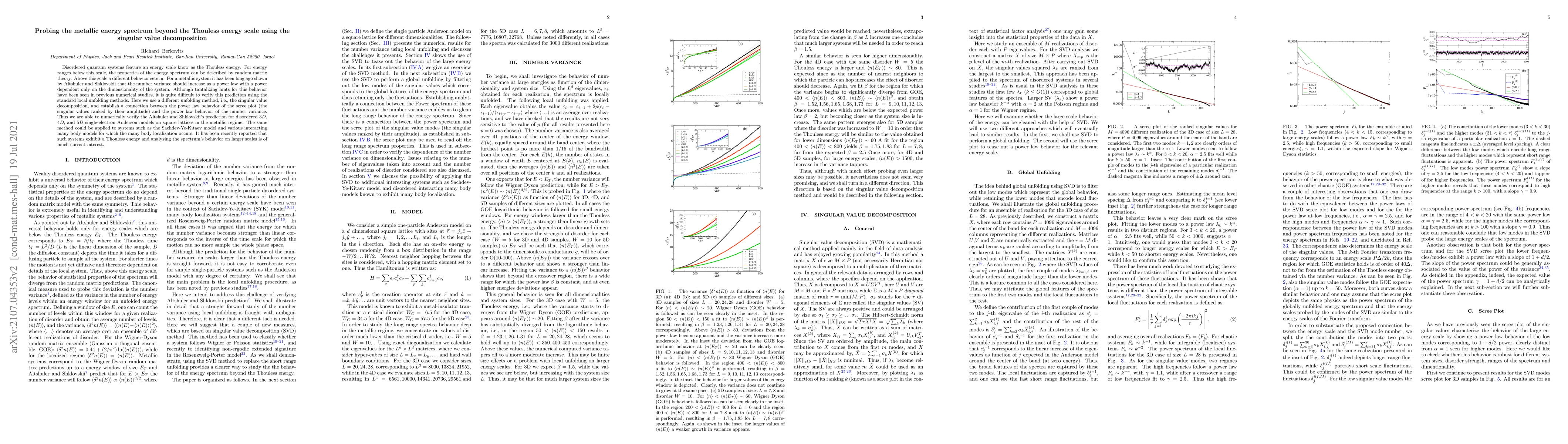 Disordered quantum systems feature an energy scale know as the Thouless energy. For energy ranges below this scale, the properties of the energy spectrum can be described by random matrix theory. Above this scale a different behavior sets in. For a metallic system it has been long ago shown by Altshuler and Shklovskii that the number variance should increase as a power law with a power dependent only on the dimensionality of the system. Although tantalizing hints for this behavior have been seen in previous numerical studies, it is quite difficult to verify this prediction using the standard local unfolding methods. Here we use a different unfolding method, i.e., the singular value decomposition, and establish a connection between the power law behavior of the scree plot (the singular values ranked by their amplitude) and the power law behavior of the number variance. Thus we are able to numerically verify the Altshuler and Shklovskii's prediction for disordered $3D$, $4D$, and $5D$ single-electron Anderson models on square lattices in the metallic regime. The same method could be applied to systems such as the Sachdev-Ye-Kitaev model and various interacting many body models for which the many body localization occurs. It has been recently reported that such systems exhibit a Thouless energy and analyzing the spectrum's behavior on larger scales is of much current interest.