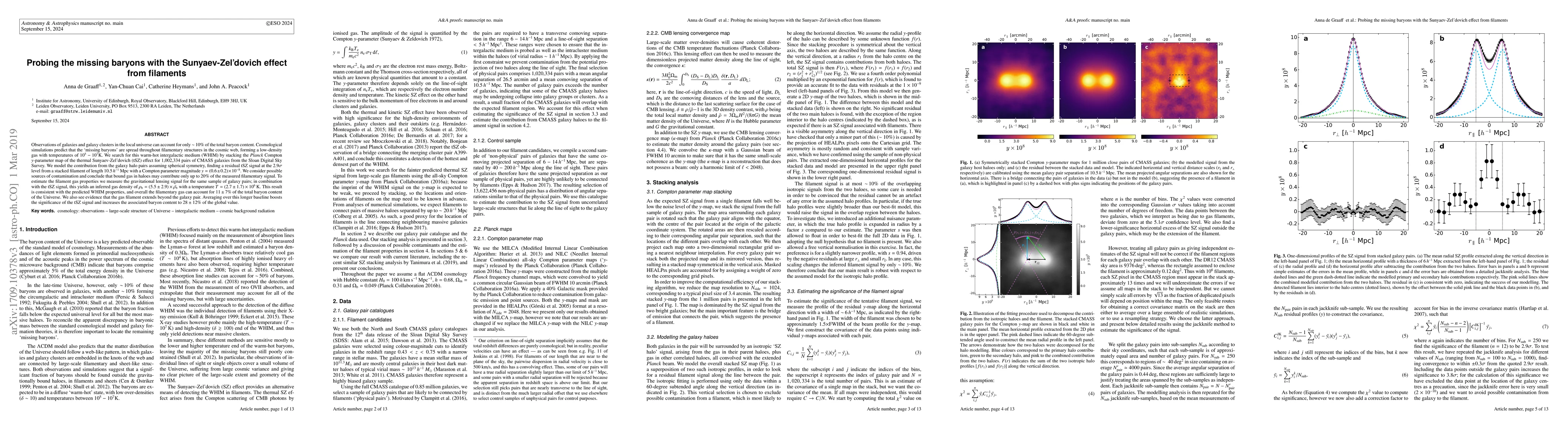 This study uses the Sunyaev-Zel'dovich effect to detect the warm-hot intergalactic medium (WHIM) in cosmic filaments, finding a residual thermal SZ signal that accounts for 11±7% of the total baryon content. The analysis suggests an extended gas filament beyond galaxy pairs, raising the baryon content estimate to 28±12%.