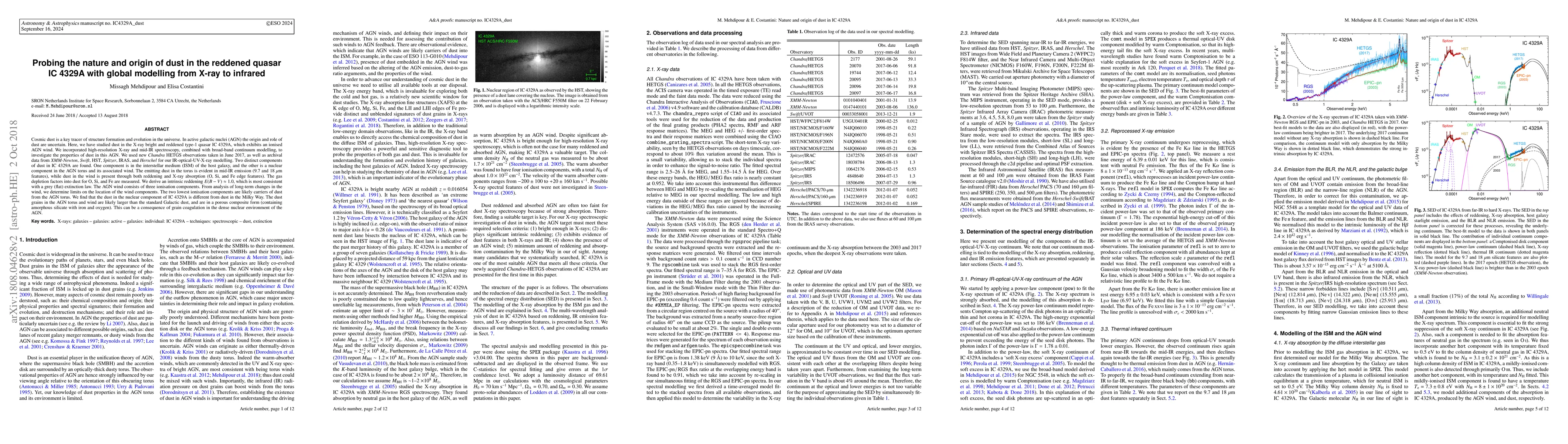 Cosmic dust is a key tracer of structure formation and evolution in the universe. In active galactic nuclei (AGN) the origin and role of dust are uncertain. Here, we have studied dust in the X-ray bright and reddened type-1 quasar IC 4329A, which exhibits an ionised AGN wind. We incorporated high-resolution X-ray and mid-IR spectroscopy, combined with broad-band continuum modelling, to investigate the properties of dust in this AGN. We used new Chandra HETGS observations taken in June 2017, as well as archival data from XMM-Newton, Swift, HST, Spitzer, IRAS, and Herschel for our IR-optical-UV-X-ray modelling. Two distinct components of dust in IC 4329A are found. One component is in the interstellar medium (ISM) of the host galaxy, and the other is a nuclear component in the AGN torus and its associated wind. The emitting dust in the torus is evident in mid-IR emission (9.7 and 18 micron features), while dust in the wind is present through both reddening and X-ray absorption (O, Si, and Fe edge features). The gas depletion factors into dust for O, Si, and Fe are measured. We derive an intrinsic reddening E(B-V) ~ 1.0, which is most consistent with a grey (flat) extinction law. The AGN wind consists of three ionisation components. From analysis of long-term changes in the wind, we determine limits on the location of the wind components. The two lowest ionisation components are likely carriers of dust from the AGN torus. We find that the dust in the nuclear component of IC 4329A is different from dust in the Milky Way. The dust grains in the AGN torus and wind are likely larger than the standard Galactic dust, and are in a porous composite form (containing amorphous silicate with iron and oxygen). This can be a consequence of grain coagulation in the dense nuclear environment of the AGN.