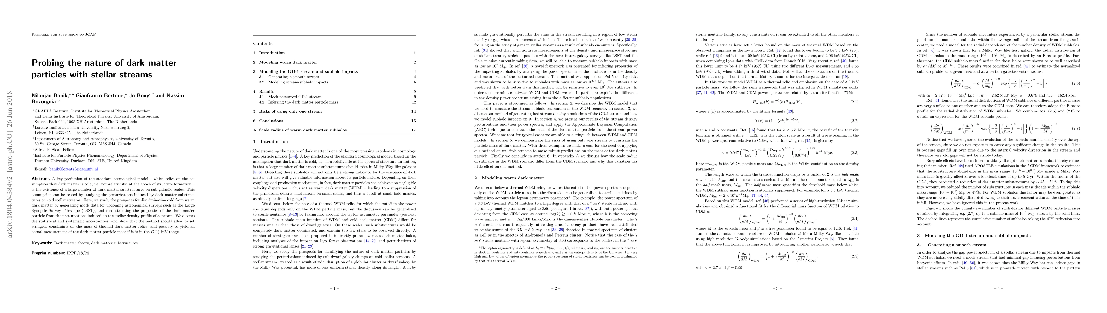 This paper explores the potential of stellar streams to probe the nature of dark matter particles by analyzing perturbations induced by dark matter substructures. Using mock data from future surveys like LSST, it aims to distinguish between cold and warm dark matter, potentially constraining the mass of dark matter particles in the keV range.