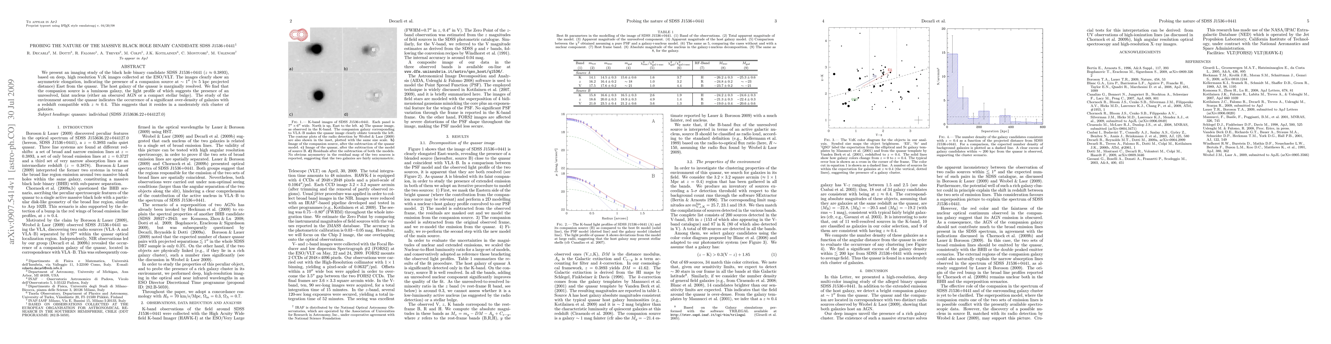 We present an imaging study of the black hole binary candidate SDSS J1536+0441 (z=0.3893), based on deep, high resolution VzK images collected at the ESO/VLT. The images clearly show an asymmetric elongation, indicating the presence of a companion source at ~1" (~5 kpc projected distance) East from the quasar. The host galaxy of the quasar is marginally resolved. We find that the companion source is a luminous galaxy, the light profile of which suggests the presence of an unresolved, faint nucleus (either an obscured AGN or a compact stellar bulge). The study of the environment around the quasar indicates the occurrence of a significant over-density of galaxies with a redshift compatible with z~0.4. This suggests that it resides in a moderately rich cluster of galaxies.