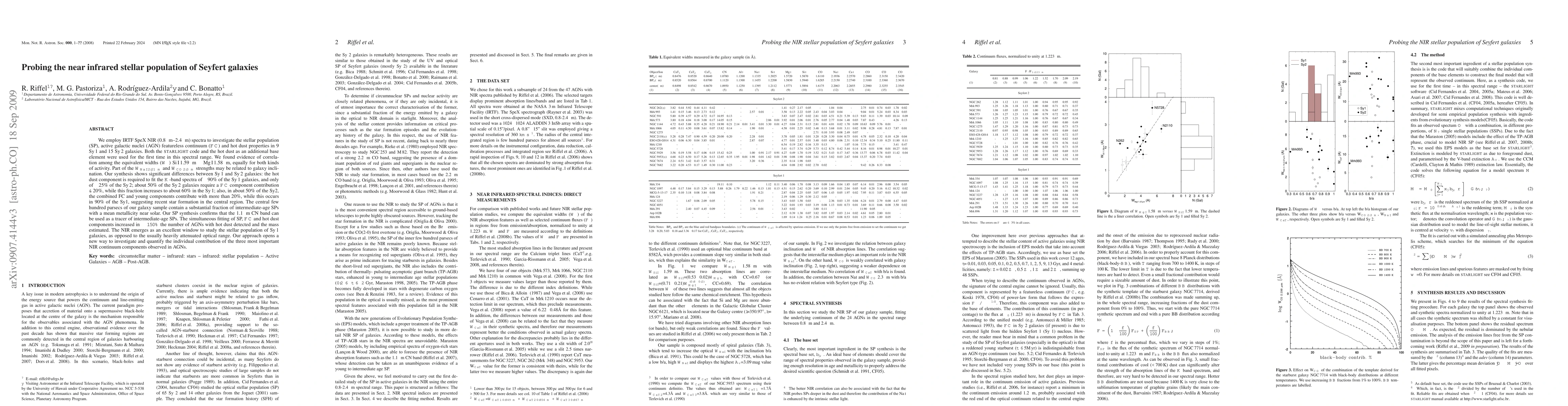 We employ IRTF SpeX NIR (0.8-2.4 microns) spectra to investigate the stellar population (SP), active galactic nuclei (AGN) featureless continuum (FC) and hot dust properties in 9 Sy 1 and 15 Sy 2 galaxies. Both the starlight code and the hot dust as an additional base element were used for the first time in this spectral range. We found evidence of correlation among the equivalent widths (W) Si I 1.59 microns x Mg I 1.58 microns, equally for both kinds of activity. Part of the W{Na I 2.21 microns} and W {CO 2.3 microns} strengths may be related to galaxy inclination. Our synthesis shows significant differences between Sy 1 and Sy 2 galaxies: the hot dust component is required to fit the K-band spectra of ~90% of the Sy 1 galaxies, and only of ~25% of the Sy 2; about 50 % of the Sy 2 galaxies require a $FC$ component contribution >20%, while this fraction increases to 60% in the Sy 1; also, in about 50 % of the Sy2, the combined FC and young components contribute with more than 20%, while this occurs in 90% of the Sy1, suggesting recent star formation in the central region. The central few hundred parsecs of our galaxy sample contain a substantial fraction of intermediate-age SPs with a mean metallicity near solar. Our SP synthesis confirms that the 1.1 micron CN band can be used as a tracer of intermediate-age SPs. The simultaneous fitting of SP, FC and hot dust components increased in ~150% the number of AGNs with hot dust detected and the mass estimated. The NIR emerges as an excellent window to study the stellar population of Sy 1 galaxies, as opposed to the usually heavily attenuated optical range. Our approach opens a new way to investigate and quantify the individual contribution of the three most important NIR continuum components observed in AGNs.