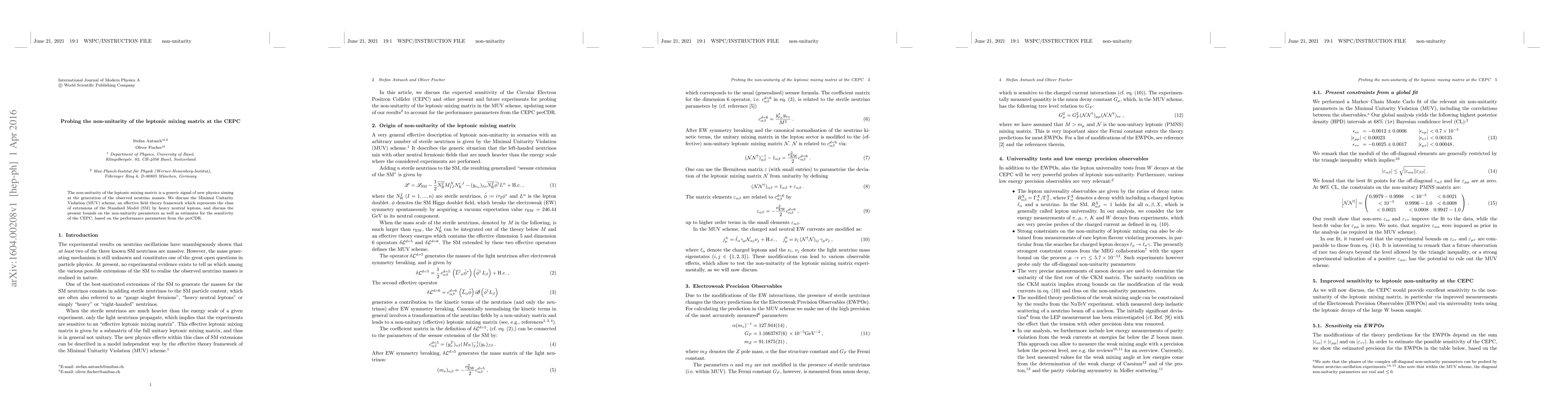 This paper investigates the potential non-unitarity in the leptonic mixing matrix, a possible sign of new physics beyond the Standard Model, using the Minimal Unitarity Violation scheme. It assesses current constraints on non-unitarity parameters and projects the Circular Electron Positron Collider's capability to detect such deviations.