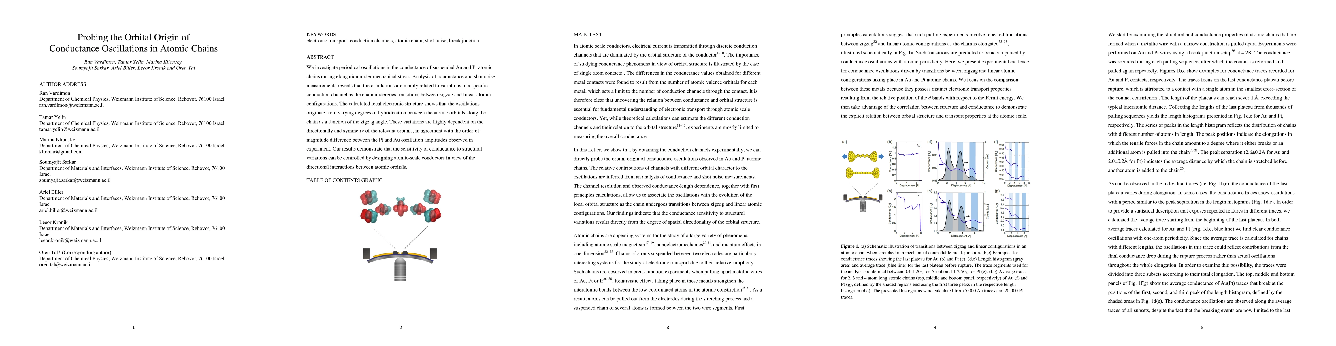 This study reveals that conductance oscillations in atomic chains of Au and Pt are due to transitions between zigzag and linear configurations, driven by mechanical stress. The oscillations arise from changes in orbital hybridization, highlighting the influence of orbital symmetry and directionality on conductance sensitivity.