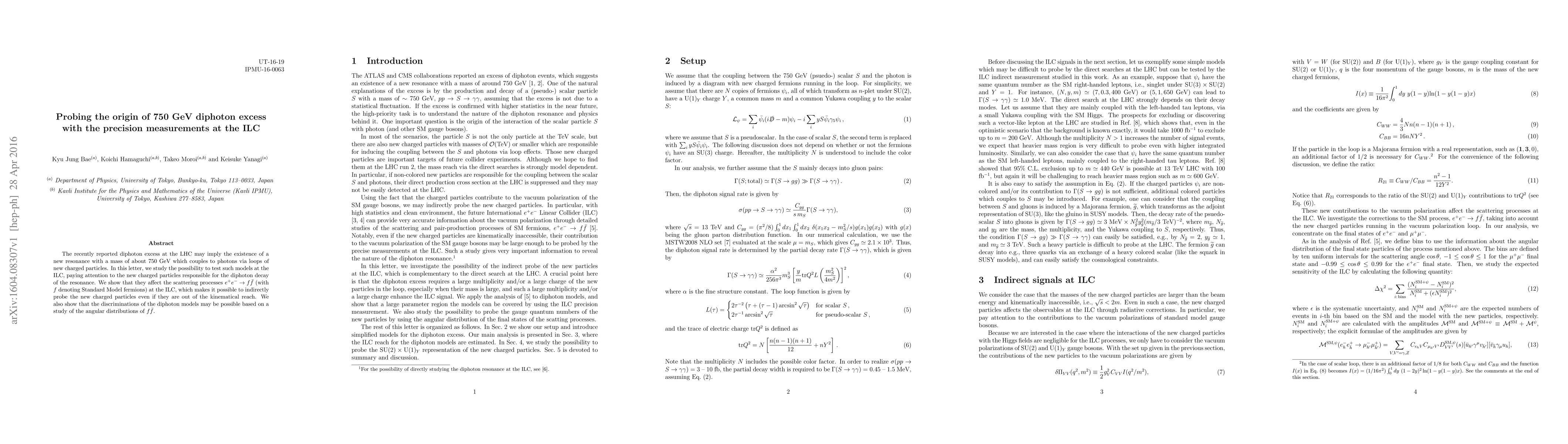 The recently reported diphoton excess at the LHC may imply the existence of a new resonance with a mass of about 750 GeV which couples to photons via loops of new charged particles. In this letter, we study the possibility to test such models at the ILC, paying attention to the new charged particles responsible for the diphoton decay of the resonance. We show that they affect the scattering processes $e^+e^- \to f\bar{f}$ (with $f$ denoting Standard Model fermions) at the ILC, which makes it possible to indirectly probe the new charged particles even if they are out of the kinematical reach. We also show that the discriminations of the diphoton models may be possible based on a study of the angular distributions of $f\bar{f}$.