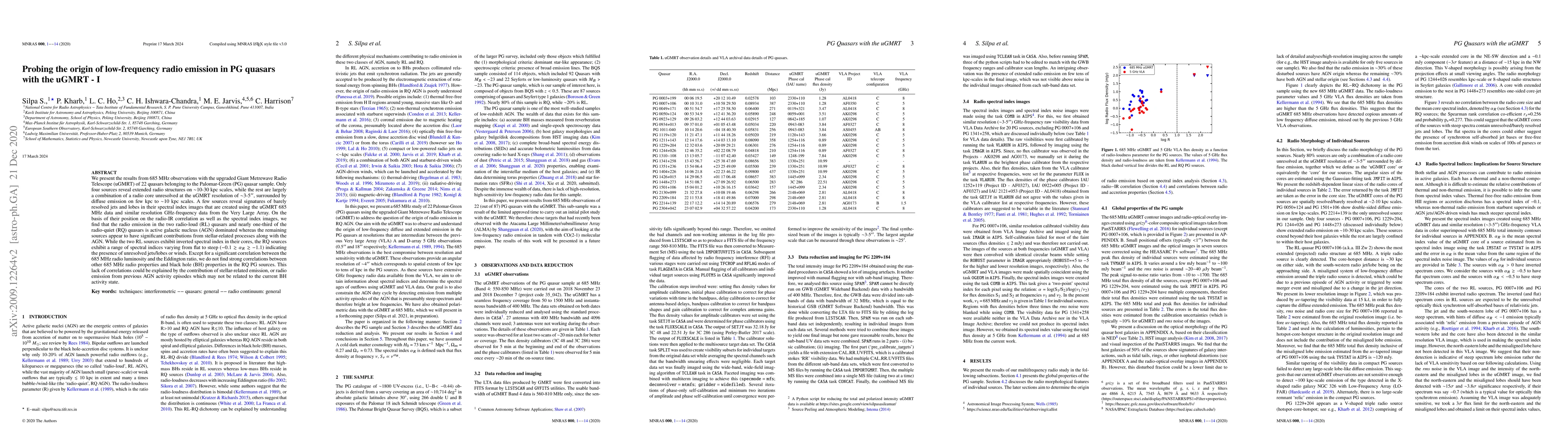 Researchers studied radio emission in 22 quasars using the uGMRT telescope, finding that only four have extended radio structures, while most are powered by active galactic nucleus activity or stellar processes.