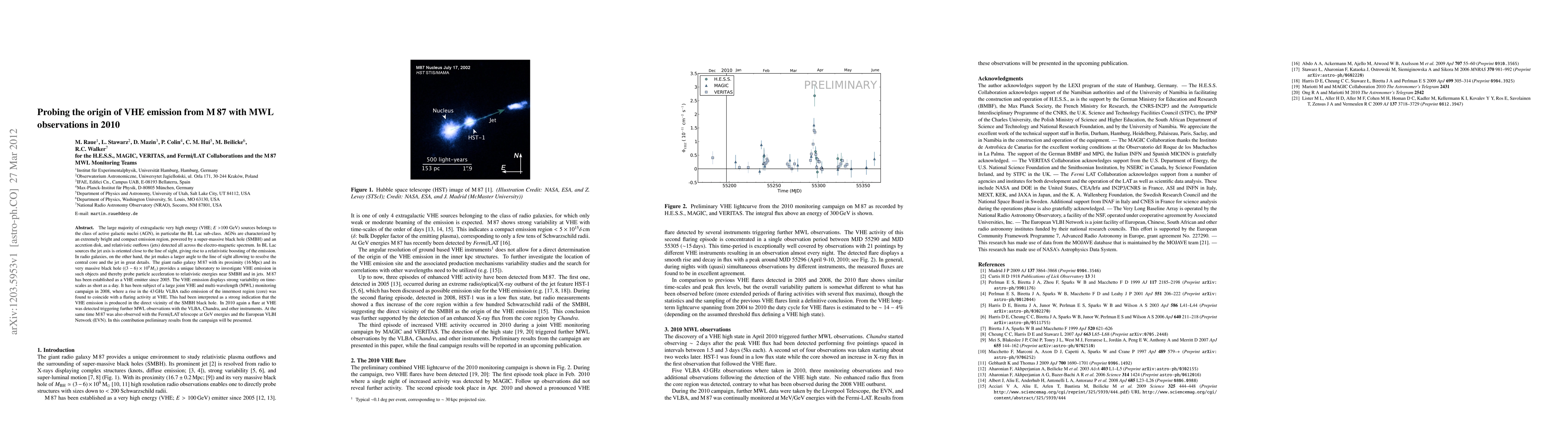 The large majority of extragalactic very high energy (VHE; E>100 GeV) sources belongs to the class of active galactic nuclei (AGN), in particular the BL Lac sub-class. AGNs are characterized by an extremely bright and compact emission region, powered by a super-massive black hole (SMBH) and an accretion disk, and relativistic outflows (jets) detected all across the electro-magnetic spectrum. In BL Lac sources the jet axis is oriented close to the line of sight, giving rise to a relativistic boosting of the emission. In radio galaxies, on the other hand, the jet makes a larger angle to the line of sight allowing to resolve the central core and the jet in great details. The giant radio galaxy M 87 with its proximity (1 6Mpc) and its very massive black hole ((3-6) x 10^9 M_solar) provides a unique laboratory to investigate VHE emission in such objects and thereby probe particle acceleration to relativistic energies near SMBH and in jets. M 87 has been established as a VHE emitter since 2005. The VHE emission displays strong variability on time-scales as short as a day. It has been subject of a large joint VHE and multi-wavelength (MWL) monitoring campaign in 2008, where a rise in the 43 GHz VLBA radio emission of the innermost region (core) was found to coincide with a flaring activity at VHE. This had been interpreted as a strong indication that the VHE emission is produced in the direct vicinity of the SMBH black hole. In 2010 again a flare at VHE was detected triggering further MWL observations with the VLBA, Chandra, and other instruments. At the same time M 87 was also observed with the Fermi-LAT telescope at GeV energies and the European VLBI Network (EVN). In this contribution preliminary results from the campaign will be presented.