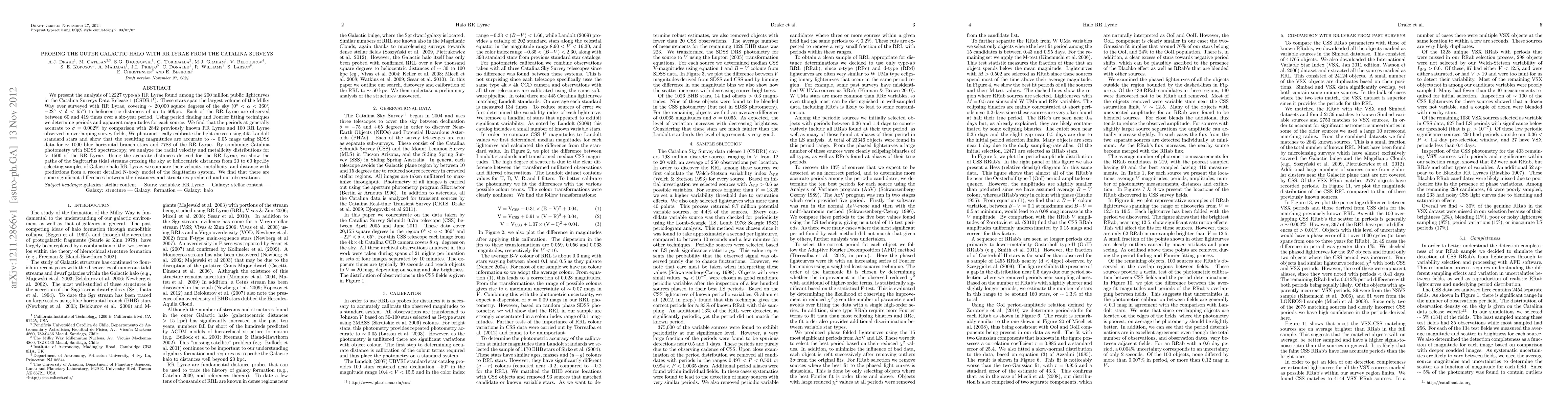 We present the analysis of 12227 type-ab RR Lyrae found among the 200 million public lightcurves in the Catalina Surveys Data Release 1 (CSDR1). These stars span the largest volume of the Milky Way ever surveyed with RR Lyrae, covering ~20,000 square degrees of the sky (0 < RA < 360, -22 < Dec < 65 deg) to heliocentric distances of up to 60kpc. Each of the RR Lyrae are observed between 60 and 419 times over a six-year period. Using period finding and Fourier fitting techniques we determine periods and apparent magnitudes for each source. We find that the periods at generally accurate to sigma = 0.002% by comparison with 2842 previously known RR Lyrae and 100 RR Lyrae observed in overlapping survey fields. We photometrically calibrate the light curves using 445 Landolt standard stars and show that the resulting magnitudes are accurate to ~0.05 mags using SDSS data for ~1000 blue horizontal branch stars and 7788 of the RR Lyrae. By combining Catalina photometry with SDSS spectroscopy, we analyze the radial velocity and metallicity distributions for > 1500 of the RR Lyrae. Using the accurate distances derived for the RR Lyrae, we show the paths of the Sagittarius tidal streams crossing the sky at heliocentric distances from 20 to 60 kpc. By selecting samples of Galactic halo RR Lyrae, we compare their velocity, metallicity, and distance with predictions from a recent detailed N-body model of the Sagittarius system. We find that there are some significant differences between the distances and structures predicted and our observations.