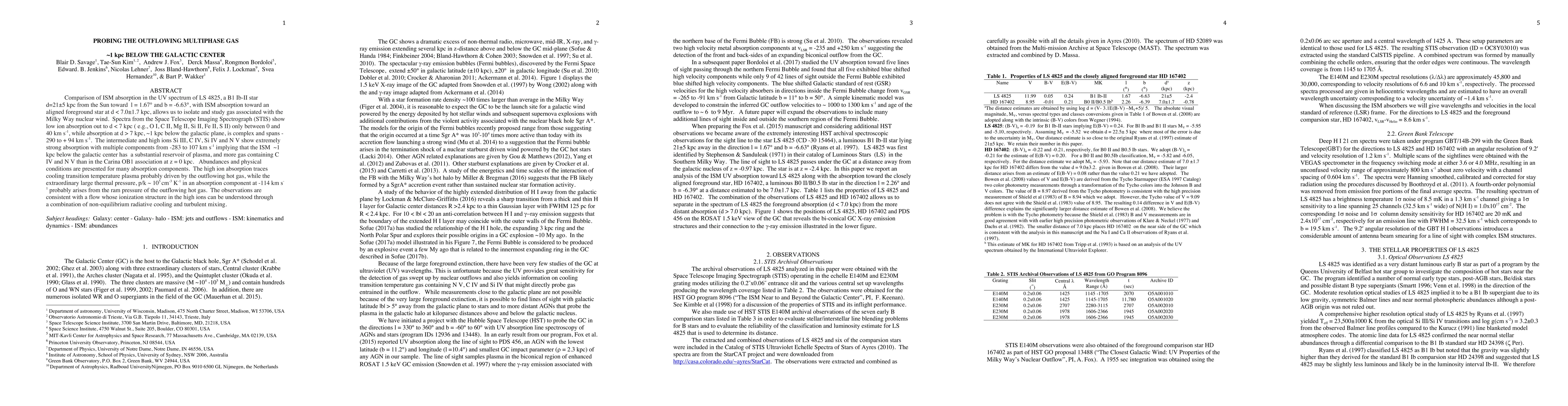 Comparison of ISM absorption in the UV spectrum of LS 4825, a B1 Ib-II star d=21+/-5 kpc from the Sun toward l = 1.67 deg and b = -6.63 deg, with ISM absorption toward an aligned foreground star at d < 7.0+/-1.7 kpc, allows us to isolate and study gas associated with the Milky Way nuclear wind. Spectra from the Space Telescope Imaging Spectrograph (STIS) show low ion absorption out to d < 7 kpc ( e.g., O I, C II, Mg II, Si II, Fe II, S II) only between 0 and 40 km/s, while absorption at d > 7 kpc, ~1 kpc below the galactic plane, is complex and spans -290 to + 94 km/ s. The intermediate and high ions Si III, C IV, Si IV and N V show extremely strong absorption with multiple components from -283 to 107 km/ s implying that the ISM ~1 kpc below the galactic center has a substantial reservoir of plasma, and more gas containing C IV and N V than in the Carina OB1 association at z = 0 kpc. Abundances and physical conditions are presented for many absorption components. The high ion absorption traces cooling transition temperature plasma probably driven by the outflowing hot gas, while the extraordinary large thermal pressure, p/k ~ 10^5 cm^-3 K^-1 in an absorption component at -114 km/s probably arises from the ram pressure of the outflowing hot gas. The observations are consistent with a flow whose ionization structure in the high ions can be understood through a combination of non-equilibrium radiative cooling and turbulent mixing.