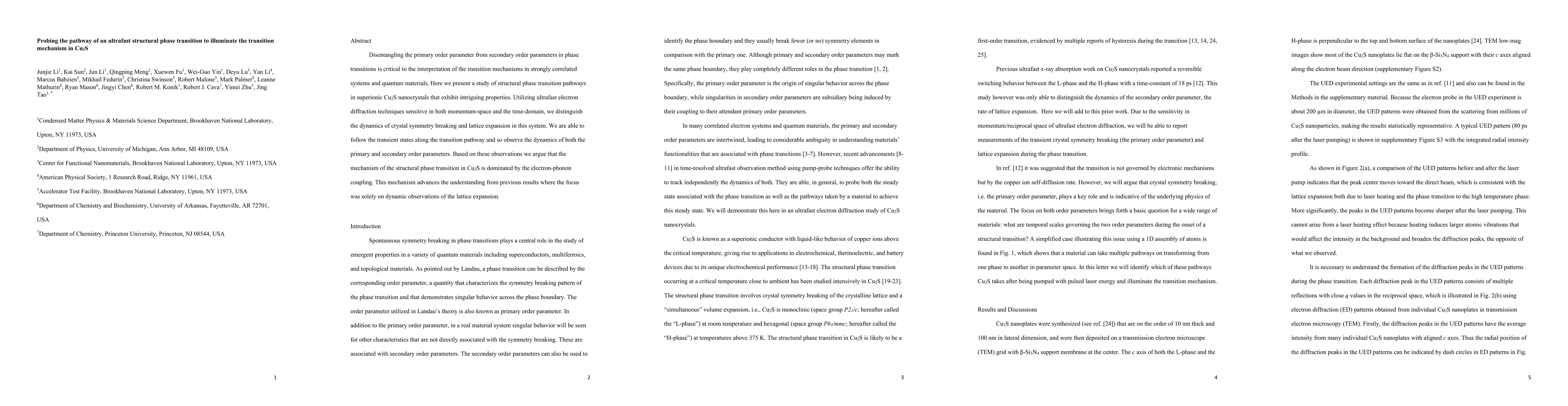 The research utilizes ultrafast electron diffraction to study Cu2S nanocrystals' structural phase transition, distinguishing primary and secondary order parameters' dynamics. Findings suggest electron-phonon coupling dominates the transition mechanism, enhancing understanding beyond previous lattice expansion observations.