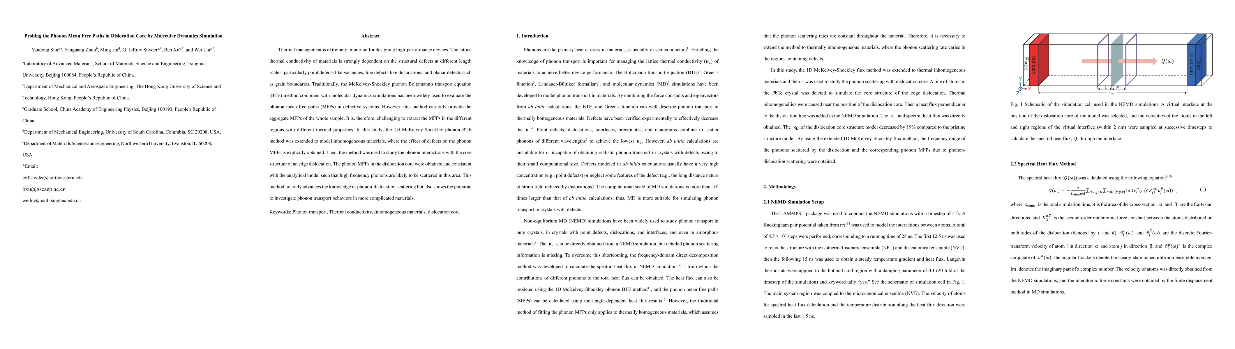 This study extends the McKelvey-Shockley phonon BTE method to model phonon mean free paths (MFPs) in inhomogeneous materials, specifically focusing on the dislocation core. The research reveals that high-frequency phonons are likely scattered in the dislocation core, providing deeper insights into phonon-dislocation interactions and the potential for studying phonon transport in complex materials.