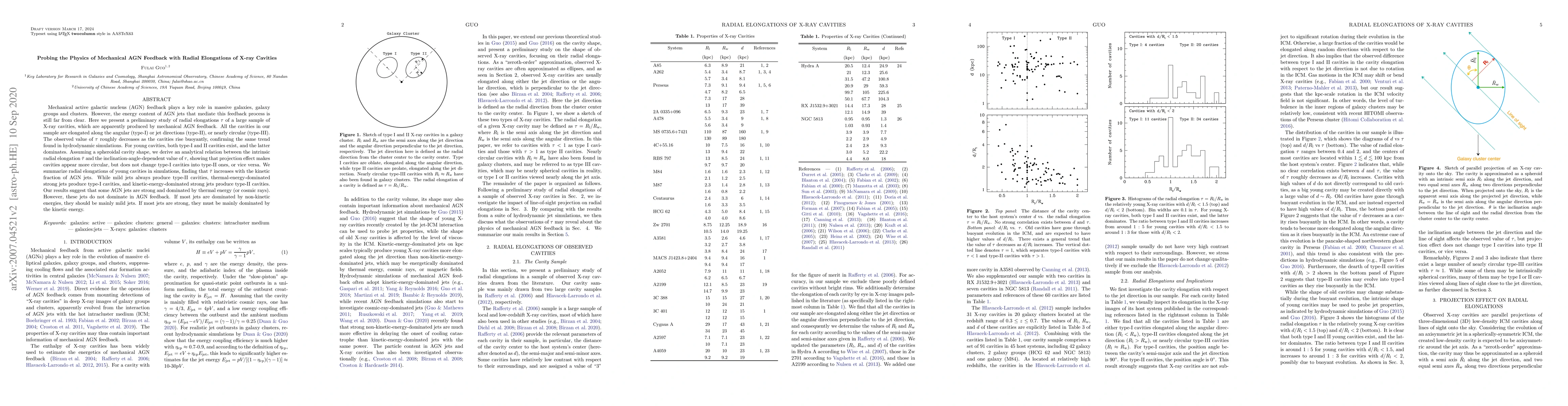 Mechanical active galactic nucleus (AGN) feedback plays a key role in massive galaxies, galaxy groups and clusters. However, the energy content of AGN jets that mediate this feedback process is still far from clear. Here we present a preliminary study of radial elongations $\tau$ of a large sample of X-ray cavities, which are apparently produced by mechanical AGN feedback. All the cavities in our sample are elongated along the angular (type-I) or jet directions (type-II), or nearly circular (type-III). The observed value of $\tau$ roughly decreases as the cavities rise buoyantly, confirming the same trend found in hydrodynamic simulations. For young cavities, both type-I and II cavities exist, and the latter dominates. Assuming a spheroidal cavity shape, we derive an analytical relation between the intrinsic radial elongation $\bar{\tau}$ and the inclination-angle-dependent value of $\tau$, showing that projection effect makes cavities appear more circular, but does not change type-I cavities into type-II ones, or vice versa. We summarize radial elongations of young cavities in simulations, finding that $\bar{\tau}$ increases with the kinetic fraction of AGN jets. While mild jets always produce type-II cavities, thermal-energy-dominated strong jets produce type-I cavities, and kinetic-energy-dominated strong jets produce type-II cavities. Our results suggest that some AGN jets are strong and dominated by thermal energy (or cosmic rays). However, these jets do not dominate in AGN feedback. If most jets are dominated by non-kinetic energies, they should be mainly mild jets. If most jets are strong, they must be mainly dominated by the kinetic energy.