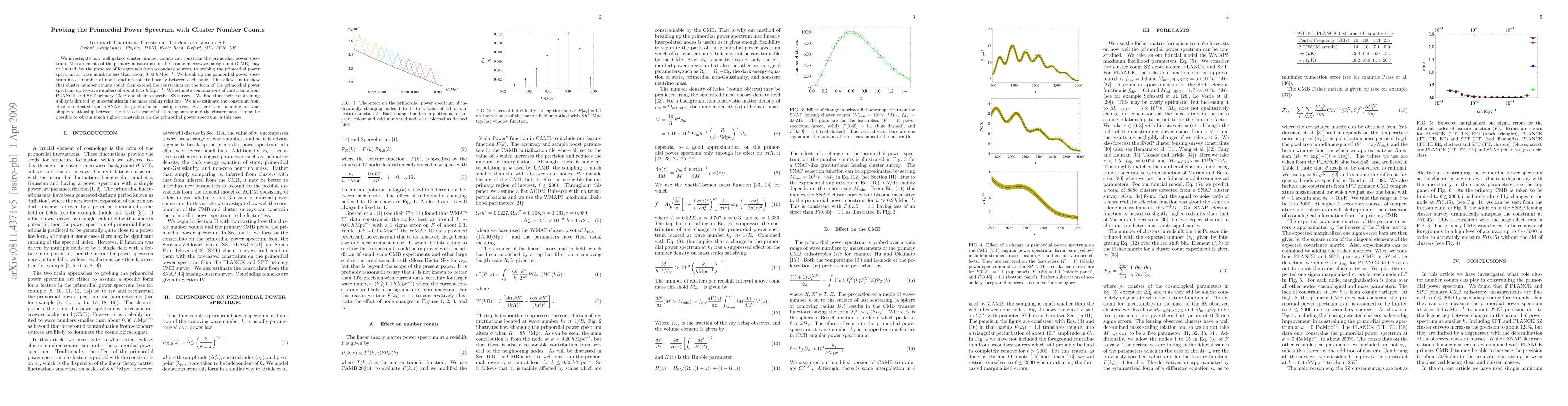 This paper explores how galaxy cluster number counts can extend the constraints on the primordial power spectrum beyond the limits of CMB measurements, potentially up to wave numbers of 0.45 h Mpc^{-1}. It finds that while current CMB and SZ surveys have limited constraining power due to uncertainties in mass scaling relations, future gravitational lensing surveys like SNAP could provide much tighter constraints due to a clear relationship between filtered shear and cluster mass.