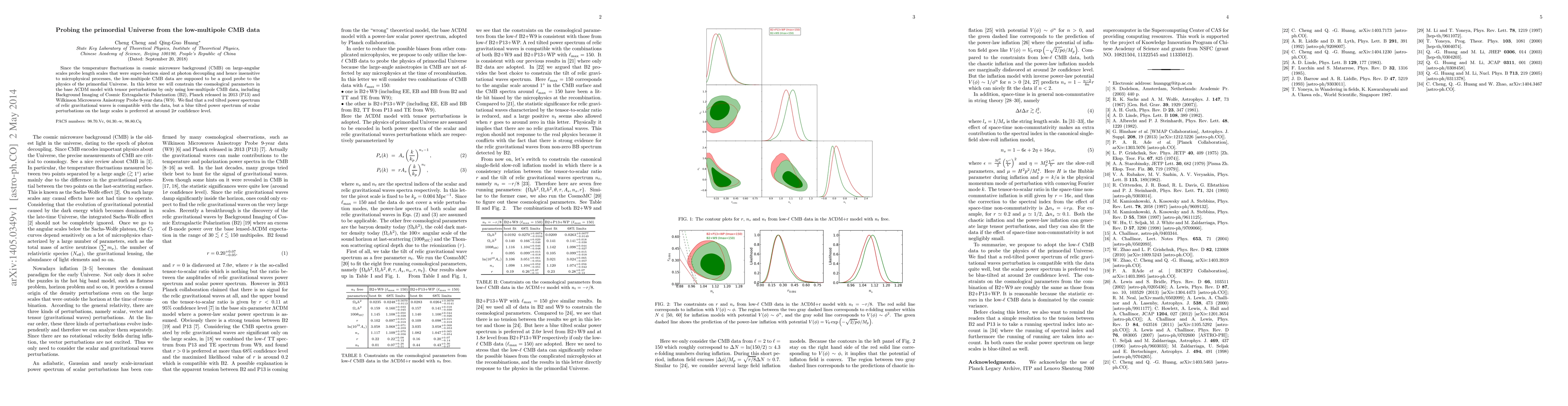 Since the temperature fluctuations in cosmic microwave background (CMB) on large-angular scales probe length scales that were super-horizon sized at photon decoupling and hence insensitive to microphysical processes, the low-multipole CMB data are supposed to be a good probe to the physics of the primordial Universe. In this letter we will constrain the cosmological parameters in the base $\Lambda$CDM model with tensor perturbations by only using low-multipole CMB data, including Background Imaging of Cosmic Extragalactic Polarization (B2), Planck released in 2013 (P13) and Wilkinson Microwaves Anisotropy Probe 9-year data (W9). We find that a red tilted power spectrum of relic gravitational waves is compatible with the data, but a blue tilted power spectrum of scalar perturbations on the large scales is preferred at around $2\sigma$ confidence level.