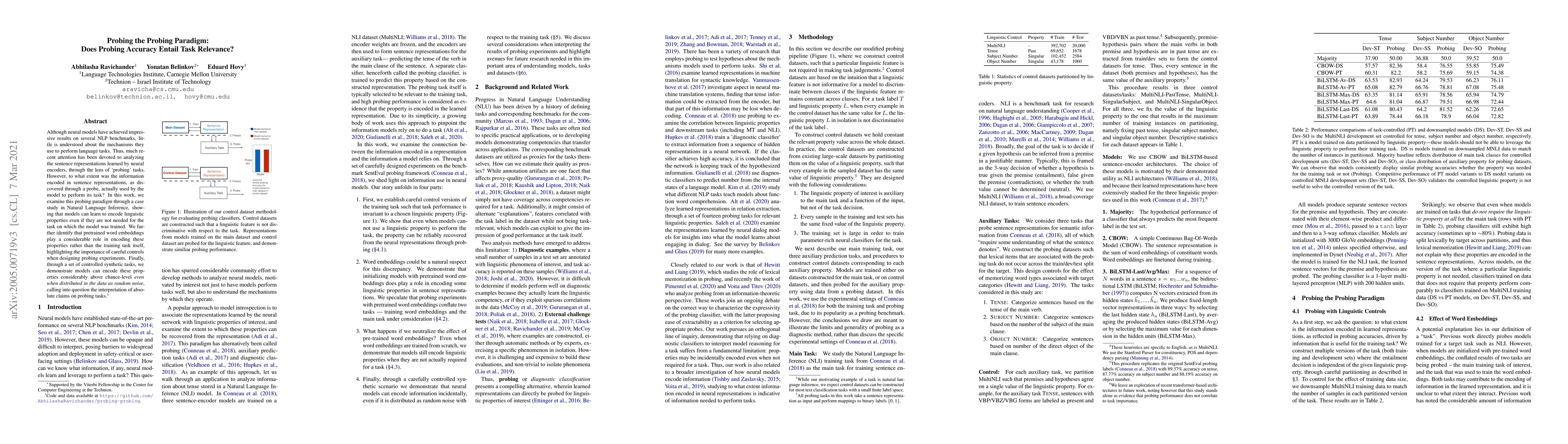 This research questions the probing paradigm in neural language models, revealing models can encode linguistic properties not needed for their task, largely due to pretrained word embeddings. Controlled experiments show models can exceed chance in encoding noise, challenging the interpretation of probing task results.