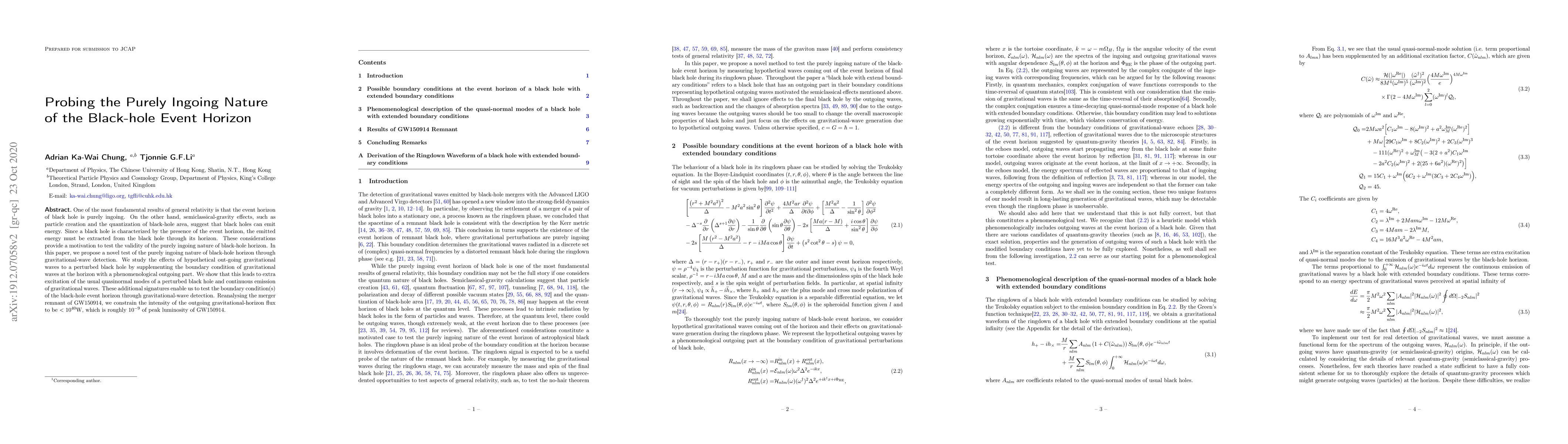This paper proposes a novel test to verify the purely ingoing nature of black-hole event horizons using gravitational-wave detection. It finds that hypothetical outgoing gravitational waves would lead to extra excitations in quasinormal modes and continuous emission, enabling constraints on the horizon's boundary conditions, with the analysis of GW150914 constraining outgoing gravitational flux to be less than $10^{40} \rm W$.