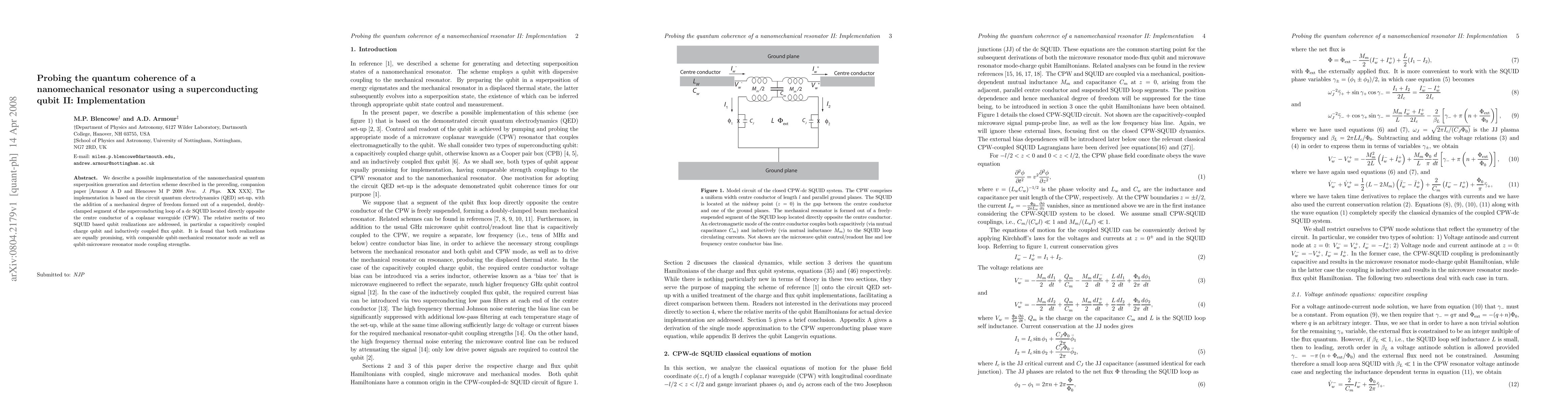 We describe a possible implementation of the nanomechanical quantum superposition generation and detection scheme described in the preceding, companion paper [Armour A D and Blencowe M P 2008 New. J. Phys. Submitted]. The implementation is based on the circuit quantum electrodynamics (QED) set-up, with the addition of a mechanical degree of freedom formed out of a suspended, doubly-clamped segment of the superconducting loop of a dc SQUID located directly opposite the centre conductor of a coplanar waveguide (CPW). The relative merits of two SQUID based qubit realizations are addressed, in particular a capacitively coupled charge qubit and inductively coupled flux qubit. It is found that both realizations are equally promising, with comparable qubit-mechanical resonator mode as well as qubit-microwave resonator mode coupling strengths.