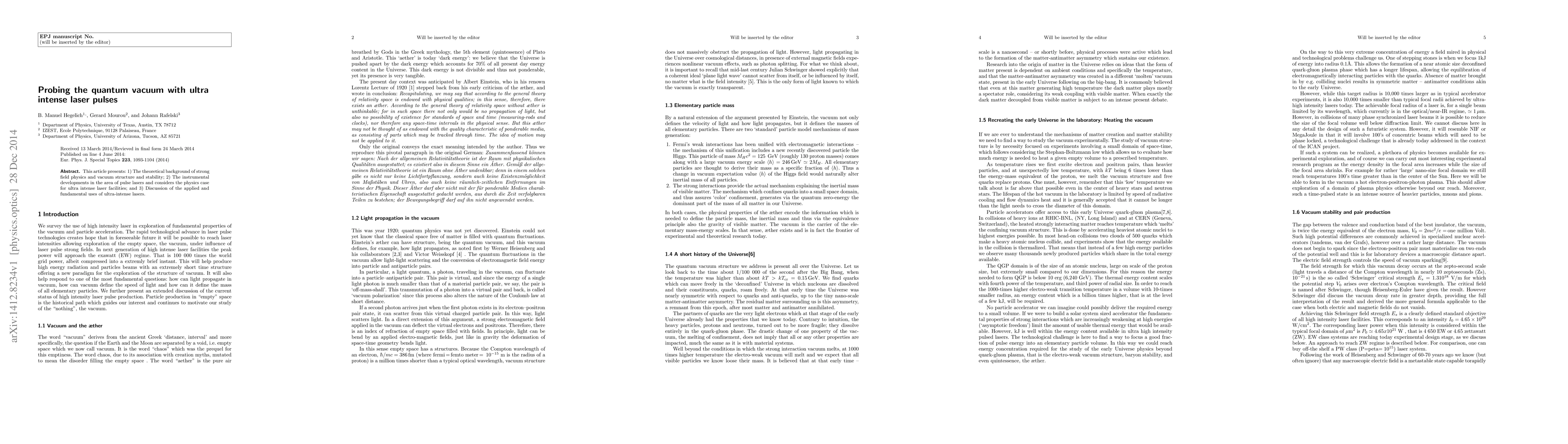 This article presents: 1) The theoretical background of strong field physics and vacuum structure and stability; 2) The instrumental developments in the area of pulse lasers and considers the physics case for ultra intense laser facilities; and 3) Discussion of the applied and fundamental uses of ultra-intense lasers.
