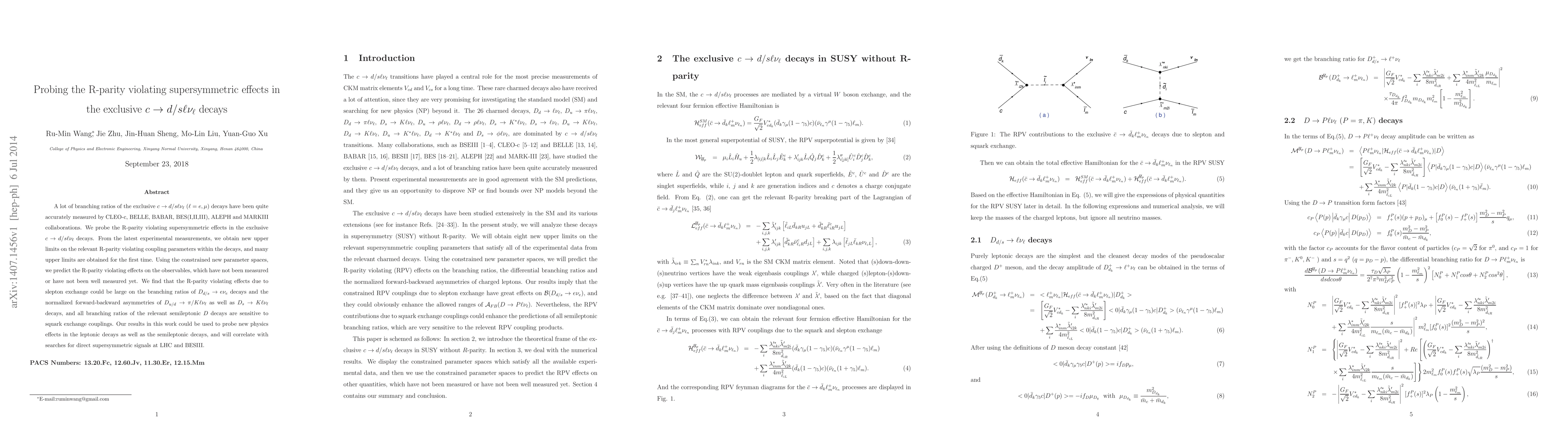 This paper investigates R-parity violating supersymmetric effects in exclusive $c \to d/s\ell\nu_\ell$ decays, deriving new upper limits on R-parity violating coupling parameters from experimental measurements. It predicts significant R-parity violating effects on unmeasured or poorly measured observables, particularly in $D_{d/s}\to e\nu_e$ and $D_{u/d}\to \pi/K \ell\nu_\ell$ decays, and suggests these results could inform searches for new physics and direct supersymmetric signals.