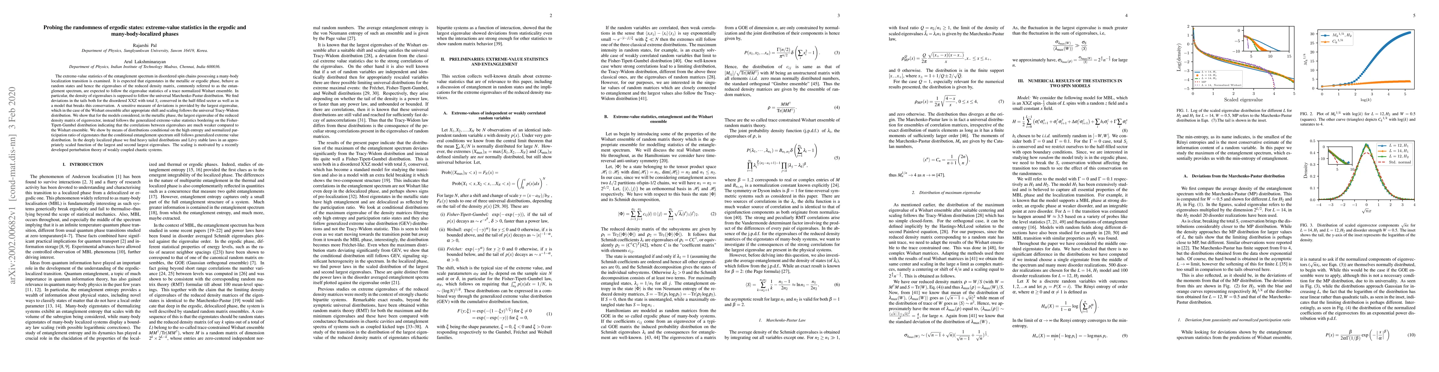 The extreme-value statistics of the entanglement spectrum in disordered spin chains possessing a many-body localization transition is examined. It is expected that eigenstates in the metallic or ergodic phase, behave as random states and hence the eigenvalues of the reduced density matrix, commonly referred to as the entanglement spectrum, are expected to follow the eigenvalue statistics of a trace normalized Wishart ensemble. In particular, the density of eigenvalues is supposed to follow the universal Marchenko-Pastur distribution. We find deviations in the tails both for the disordered XXZ with total $S_z$ conserved in the half-filled sector as well as in a model that breaks this conservation. A sensitive measure of deviations is provided by the largest eigenvalue, which in the case of the Wishart ensemble after appropriate shift and scaling follows the universal Tracy-Widom distribution. We show that for the models considered, in the metallic phase, the largest eigenvalue of the reduced density matrix of eigenvector, instead follows the generalized extreme-value statistics bordering on the Fisher-Tipett-Gumbel distribution indicating that the correlations between eigenvalues are much weaker compared to the Wishart ensemble. We show by means of distributions conditional on the high entropy and normalized participation ratio of eigenstates that the conditional entanglement spectrum still follows generalized extreme value distribution. In the deeply localized phase we find heavy tailed distributions and L\'evy stable laws in an appropriately scaled function of the largest and second largest eigenvalues. The scaling is motivated by a recently developed perturbation theory of weakly coupled chaotic systems.