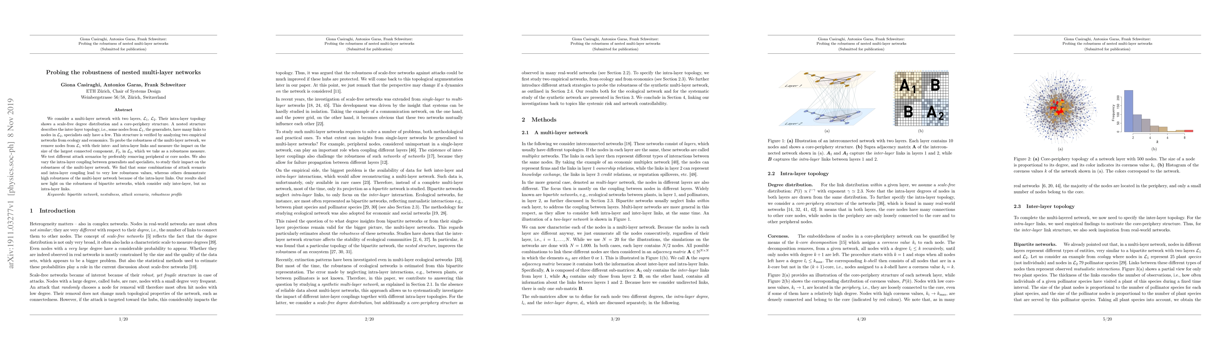 This study investigates the robustness of a nested multi-layer network with scale-free intra-layer topology and core-periphery structure, using empirical ecological and economic networks. It finds that the network's robustness depends on attack scenarios and intra-layer coupling, revealing significant differences compared to traditional bipartite network analyses.
