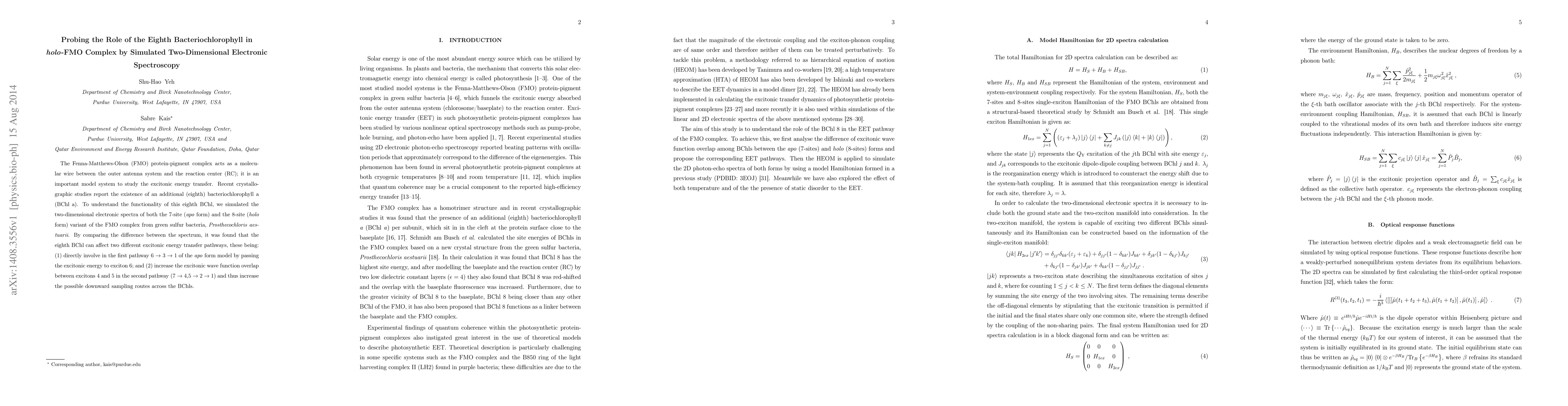 This study investigates the impact of an eighth bacteriochlorophyll a in the holo-FMO complex using simulated two-dimensional electronic spectra. The presence of the eighth BChl affects two energy transfer pathways, enhancing excitonic interactions and modifying energy transfer dynamics.