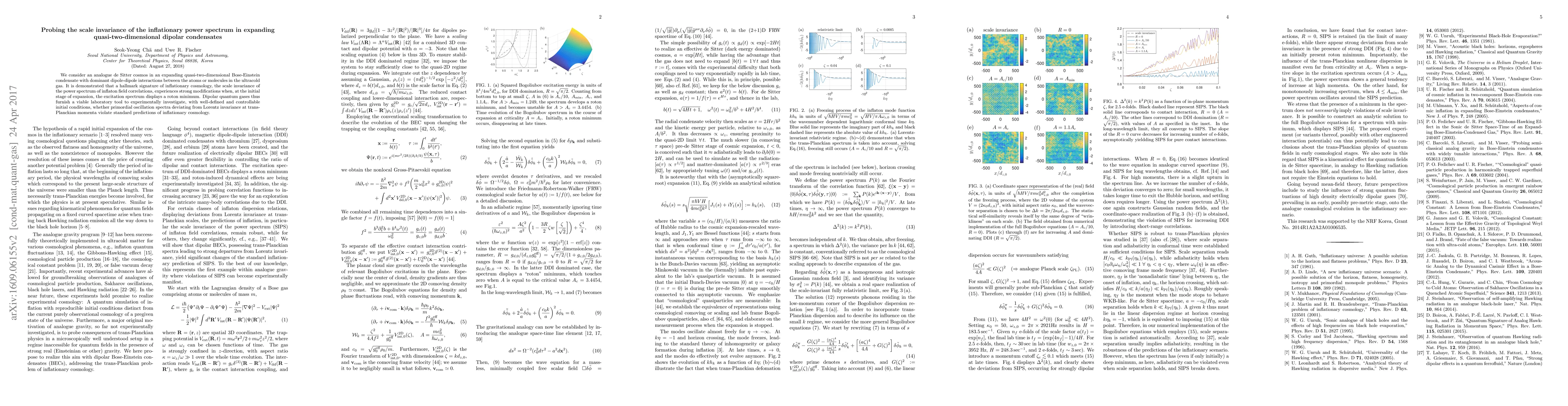 We consider an analogue de Sitter cosmos in an expanding quasi-two-dimensional Bose-Einstein condensate with dominant dipole-dipole interactions between the atoms or molecules in the ultracold gas. It is demonstrated that a hallmark signature of inflationary cosmology, the scale invariance of the power spectrum of inflaton field correlations, experiences strong modifications when, at the initial stage of expansion, the excitation spectrum displays a roton minimum. Dipolar quantum gases thus furnish a viable laboratory tool to experimentally investigate, with well-defined and controllable initial conditions, whether primordial oscillation spectra deviating from Lorentz invariance at trans-Planckian momenta violate standard predictions of inflationary cosmology.