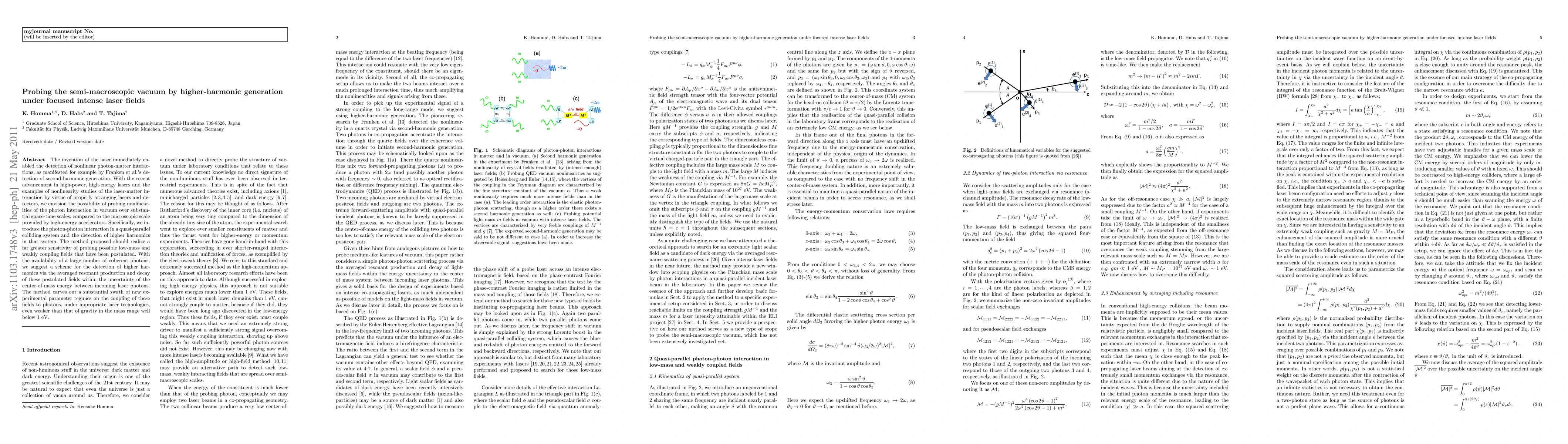 The invention of the laser immediately enabled the detection of nonlinear photon-matter interactions, as manifested for example by Franken et al.'s detection of second-harmonic generation. With the recent advancement in high-power, high-energy lasers and the examples of nonlinearity studies of the laser-matter interaction by virtue of properly arranging lasers and detectors, we envision the possibility of probing nonlinearities of the photon interaction in vacuum over substantial space-time scales, compared to the microscopic scale provided by high-energy accelerators. Specifically, we introduce the photon-photon interaction in a quasi-parallel colliding system and the detection of higher harmonics in that system. The method proposed should realize a far greater sensitivity of probing possible low-mass and weakly coupling fields that have been postulated. With the availability of a large number of coherent photons, we suggest a scheme for the detection of higher harmonics via the averaged resonant production and decay of these postulated fields within the uncertainty of the center-of-mass energy between incoming laser photons. The method carves out a substantial swath of new experimental parameter regimes on the coupling of these fields to photons, under appropriate laser technologies, even weaker than that of gravity in the mass range well below 1 eV.