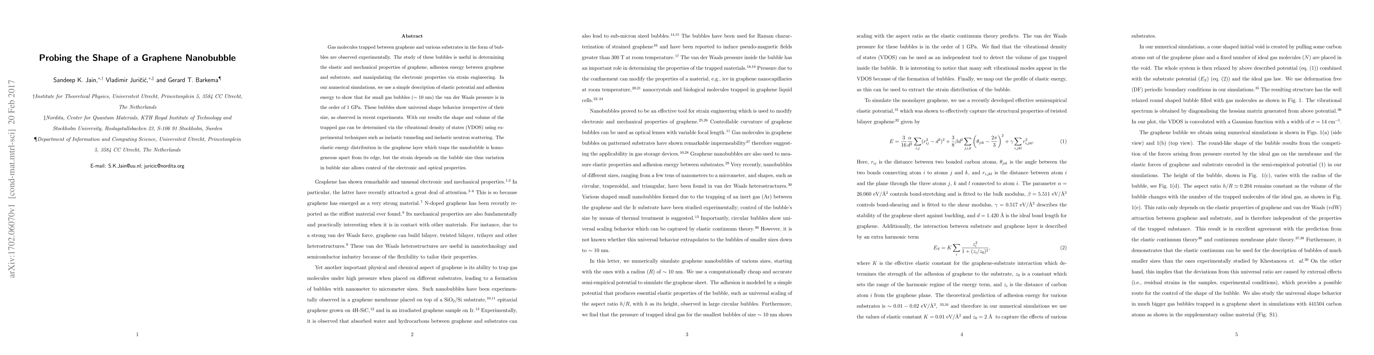 Gas molecules trapped between graphene and various substrates in the form of bubbles are observed experimentally. The study of these bubbles is useful in determining the elastic and mechanical properties of graphene, adhesion energy between graphene and substrate, and manipulating the electronic properties via strain engineering. In our numerical simulations, we use a simple description of elastic potential and adhesion energy to show that for small gas bubbles ($\sim 10$ nm) the van der Waals pressure is in the order of 1 GPa. These bubbles show universal shape behavior irrespective of their size, as observed in recent experiments. With our results the shape and volume of the trapped gas can be determined via the vibrational density of states (VDOS) using experimental techniques such as inelastic tunneling and inelastic neutron scattering. The elastic energy distribution in the graphene layer which traps the nanobubble is homogeneous apart from its edge, but the strain depends on the bubble size thus variation in bubble size allows control of the electronic and optical properties.
