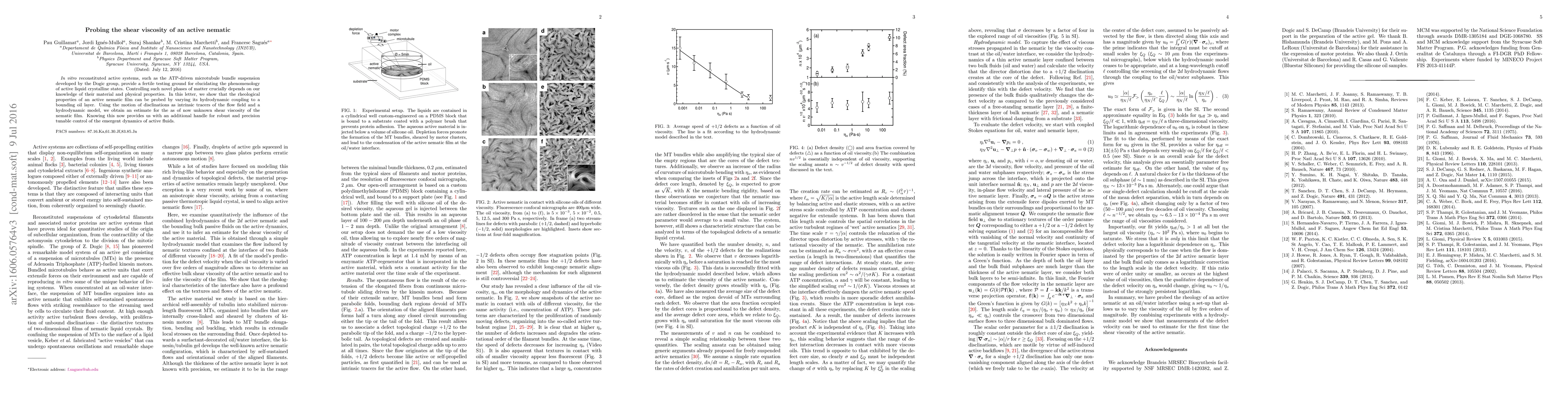 In vitro reconstituted active systems, such as the ATP-driven microtubule bundle suspension developed by the Dogic group, provide a fertile testing ground for elucidating the phenomenology of active liquid crystalline states. Controlling such novel phases of matter crucially depends on our knowledge of their material and physical properties. In this letter, we show that the rheological properties of an active nematic film can be probed by varying its hydrodynamic coupling to a bounding oil layer. Using the motion of disclinations as intrinsic tracers of the flow field and a hydrodynamic model, we obtain an estimate for the as of now unknown shear viscosity of the nematic film. Knowing this now provides us with an additional handle for robust and precision tunable control of the emergent dynamics of active fluids.