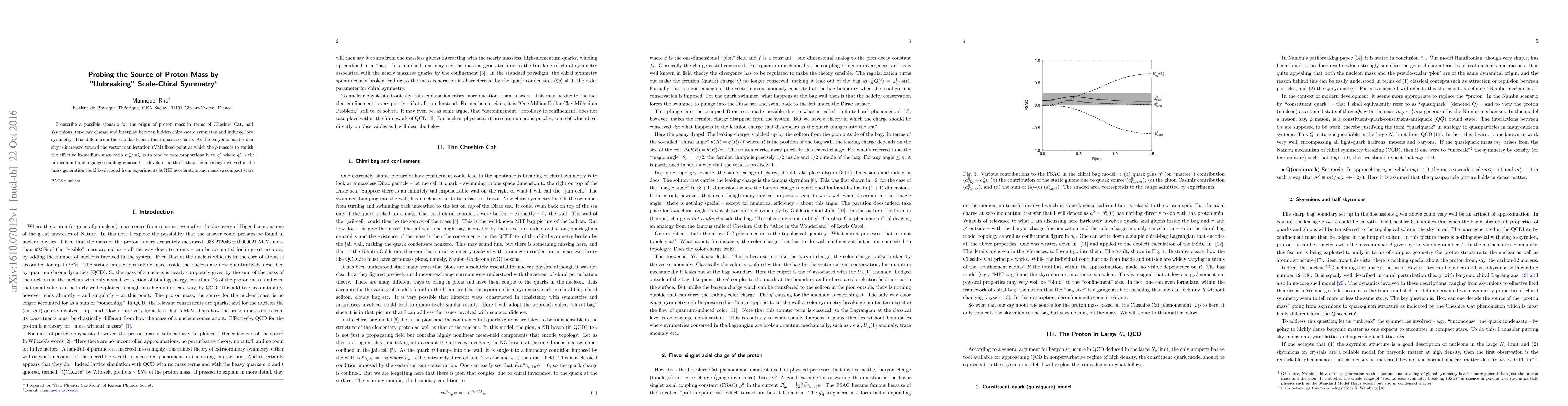 I describe a possible scenario for the origin of proton mass in terms of Cheshire Cat, half-skyrmions, topology change and interplay between hidden chiral-scale symmetry and induced local symmetry. This differs from the standard constituent-quark scenario. As the baryonic matter density is increased toward the vector manifestation (VM) fixed-point at which the $\rho$ mass is to vanish, the effective in-medium mass ratio $m^*_\rho/m^*_N$ is to tend to zero proportionally to $g^*_\rho$ where $g^*_\rho$ is the in-medium hidden gauge coupling constant. I develop the thesis that the intricacy involved in the mass generation could be decoded from experiments at RIB accelerators and massive compact stars.