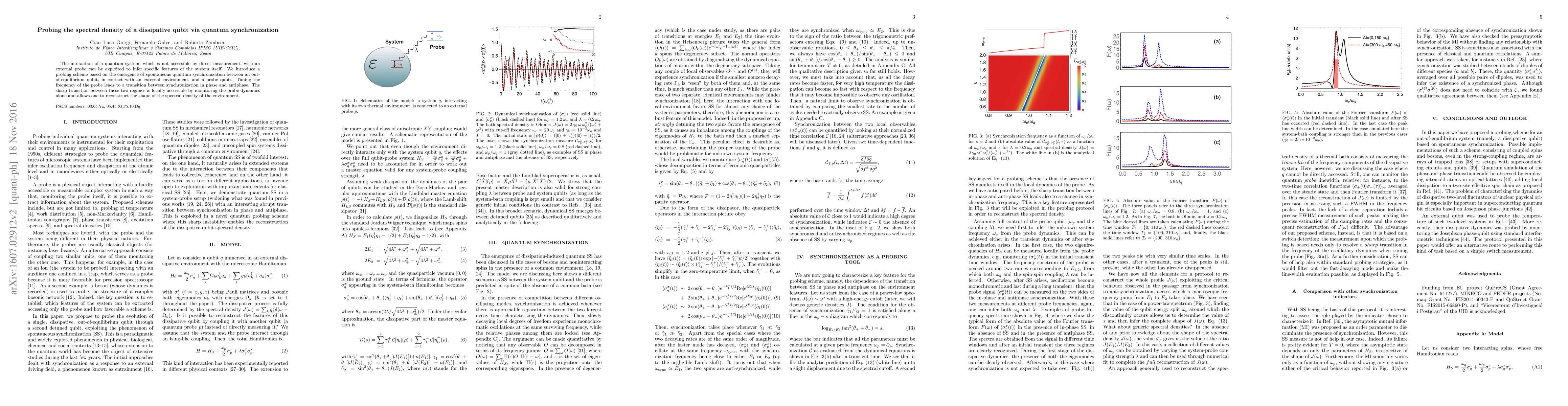 The interaction of a quantum system, which is not accessible by direct measurement, with an external probe can be exploited to infer specific features of the system itself. We introduce a probing scheme based on the emergence of spontaneous quantum synchronization between an out-of-equilibrium qubit, in contact with an external environment, and a probe qubit. Tuning the frequency of the probe leads to a transition between synchronization in phase and antiphase. The sharp transition between these two regimes is locally accessible by monitoring the probe dynamics alone and allows one to reconstruct the shape of the spectral density of the environment.