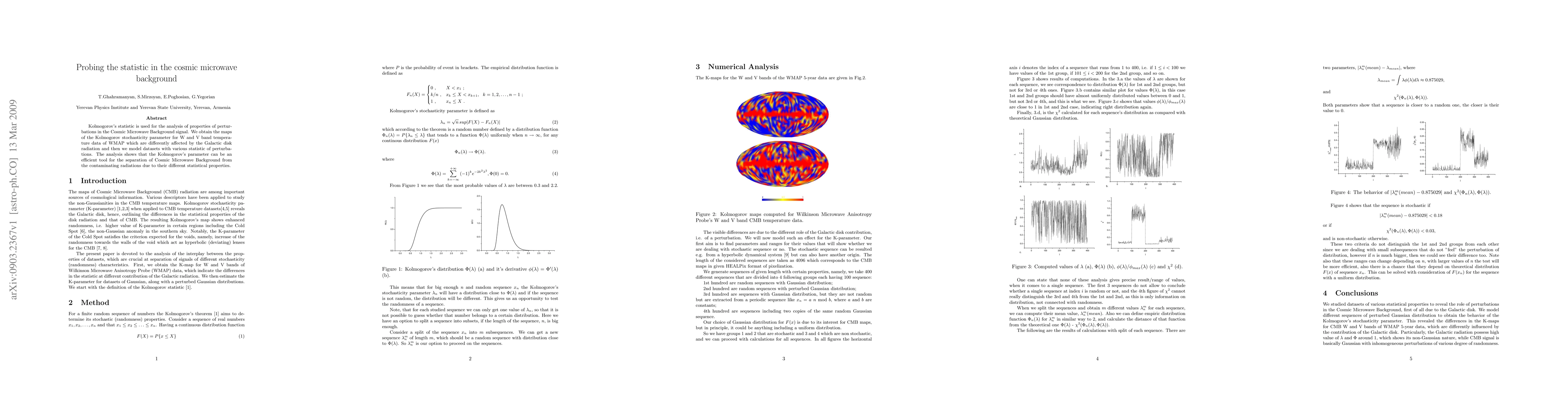 Kolmogorov's statistic is used for the analysis of properties of perturbations in the Cosmic Microwave Background signal. We obtain the maps of the Kolmogorov stochasticity parameter for W and V band temperature data of WMAP which are differently affected by the Galactic disk radiation and then we model datasets with various statistic of perturbations. The analysis shows that the Kolmogorov's parameter can be an efficient tool for the separation of Cosmic Microwave Background from the contaminating radiations due to their different statistical properties.