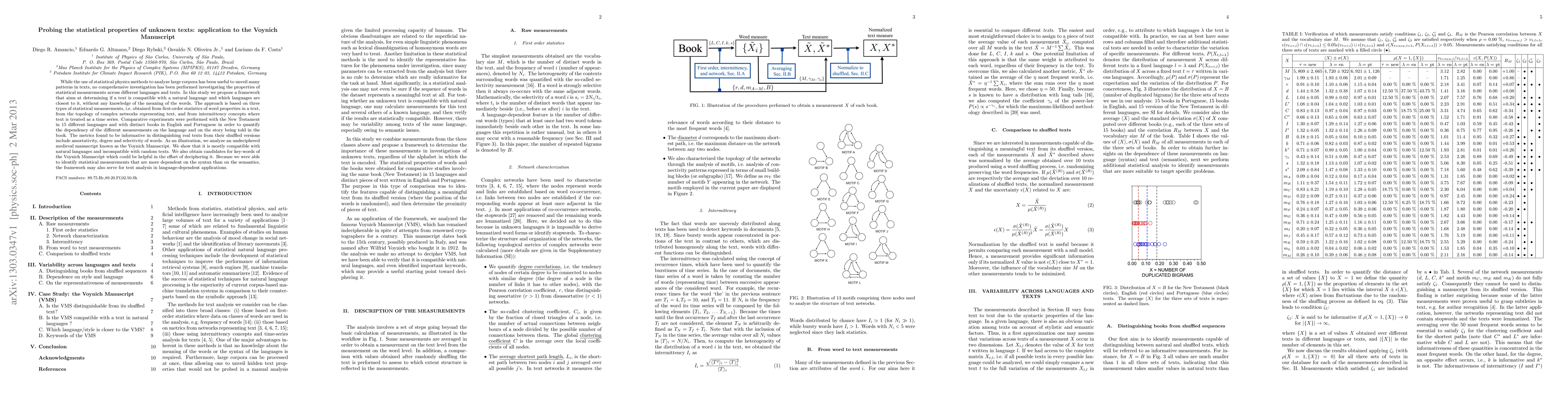 While the use of statistical physics methods to analyze large corpora has been useful to unveil many patterns in texts, no comprehensive investigation has been performed investigating the properties of statistical measurements across different languages and texts. In this study we propose a framework that aims at determining if a text is compatible with a natural language and which languages are closest to it, without any knowledge of the meaning of the words. The approach is based on three types of statistical measurements, i.e. obtained from first-order statistics of word properties in a text, from the topology of complex networks representing text, and from intermittency concepts where text is treated as a time series. Comparative experiments were performed with the New Testament in 15 different languages and with distinct books in English and Portuguese in order to quantify the dependency of the different measurements on the language and on the story being told in the book. The metrics found to be informative in distinguishing real texts from their shuffled versions include assortativity, degree and selectivity of words. As an illustration, we analyze an undeciphered medieval manuscript known as the Voynich Manuscript. We show that it is mostly compatible with natural languages and incompatible with random texts. We also obtain candidates for key-words of the Voynich Manuscript which could be helpful in the effort of deciphering it. Because we were able to identify statistical measurements that are more dependent on the syntax than on the semantics, the framework may also serve for text analysis in language-dependent applications.