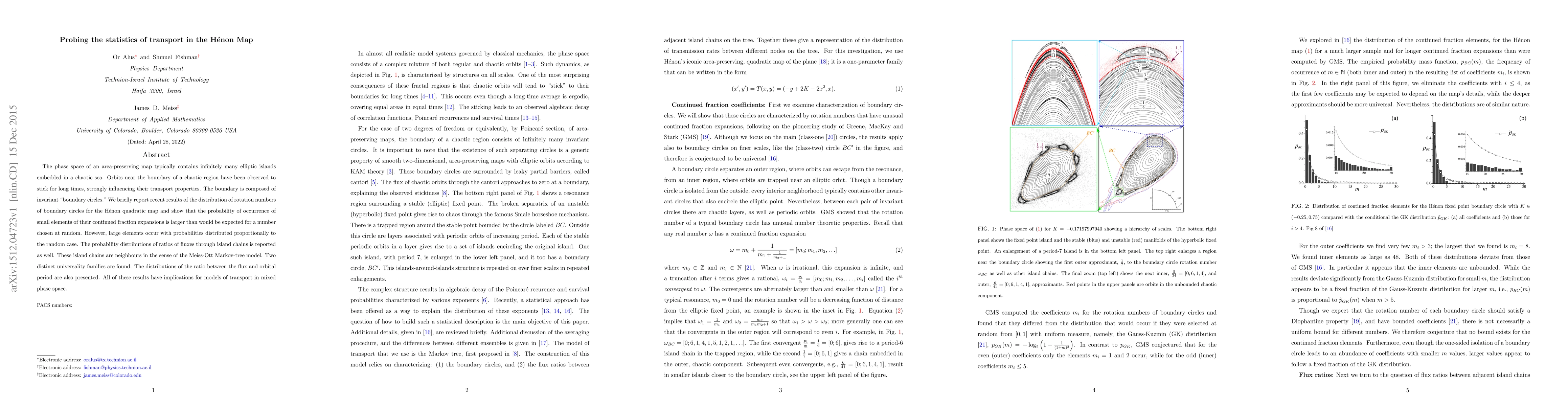 The phase space of an area-preserving map typically contains infinitely many elliptic islands embedded in a chaotic sea. Orbits near the boundary of a chaotic region have been observed to stick for long times, strongly influencing their transport properties. The boundary is composed of invariant "boundary circles". We briefly report recent results of the distribution of rotation numbers of boundary circles for the H\'enon quadratic map and show that the probability of occurrence of small elements of their continued fraction expansions is larger than would be expected for a number chosen at random. However, large elements occur with probabilities distributed proportionally to the random case. The probability distributions of ratios of fluxes through island chains is reported as well. These island chains are neighbours in the sense of the Meiss-Ott Markov-tree model. Two distinct universality families are found. The distributions of the ratio between the flux and orbital period are also presented. All of these results have implications for models of transport in mixed phase space.