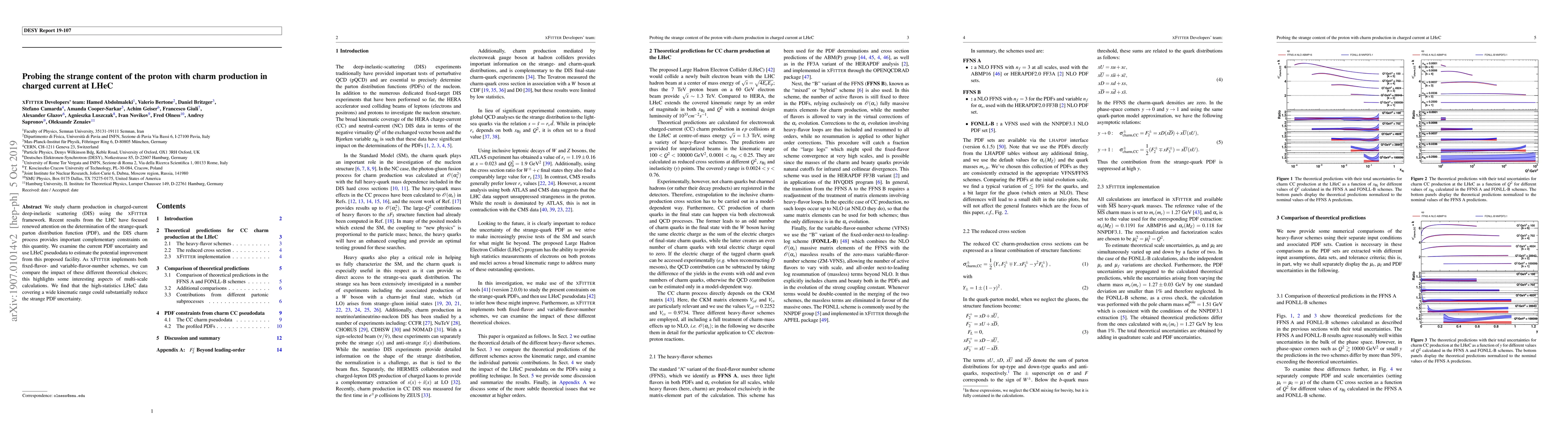 This study investigates charm production in charged-current deep-inelastic scattering using the xFitter framework to determine the strange-quark parton distribution function (PDF). The research highlights the potential of LHeC pseudodata to significantly reduce uncertainties in the strange PDF, emphasizing the impact of different theoretical schemes in multi-scale calculations.