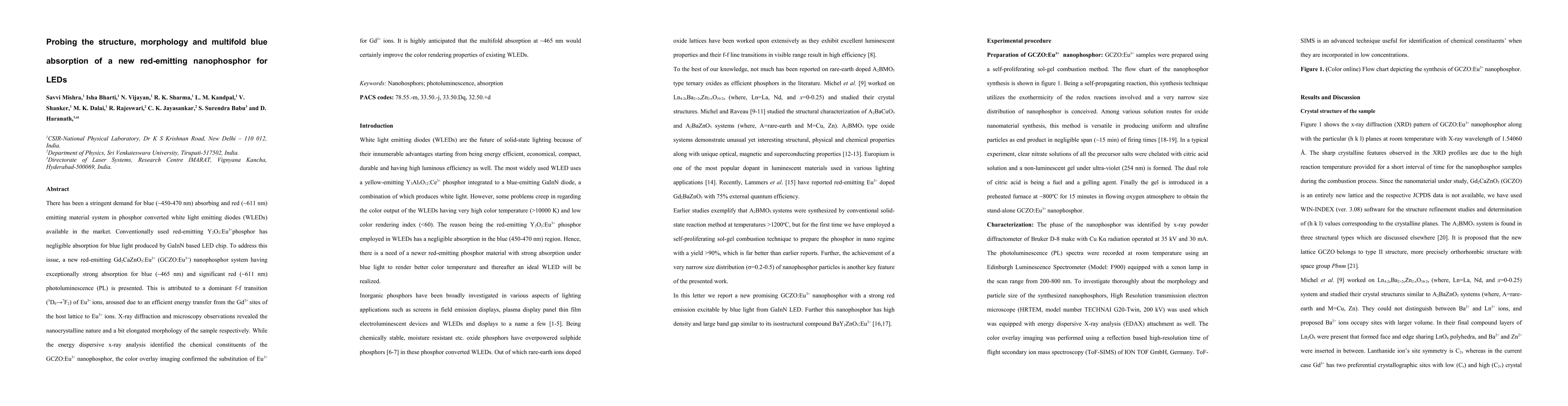 There has been a stringent demand for blue (~450-470 nm) absorbing and red (~611 nm) emitting material system in phosphor converted white light emitting diodes (WLEDs) available in the market. Conventionally used red-emitting Y2O3:Eu3+phosphor has negligible absorption for blue light produced by GaInN based LED chip. To address this issue, a new red-emitting Gd2CaZnO5:Eu3+ (GCZO:Eu3+) nanophosphor system having exceptionally strong absorption for blue (~465 nm) and significant red (~611 nm) photoluminescence (PL) is presented. This is attributed to a dominant f-f transition (5D0\rightarrow7F2) of Eu3+ ions, aroused due to an efficient energy transfer from the Gd3+ sites of the host lattice to Eu3+ ions. X-ray diffraction and microscopy observations revealed the nanocrystalline nature and a bit elongated morphology of the sample respectively. While the energy dispersive x-ray analysis identified the chemical constituents of the GCZO:Eu3+ nanophosphor, the color overlay imaging confirmed the substitution of Eu3+ for Gd3+ ions. It is highly anticipated that the multifold absorption at ~465 nm would certainly improve the color rendering properties of existing WLEDs.