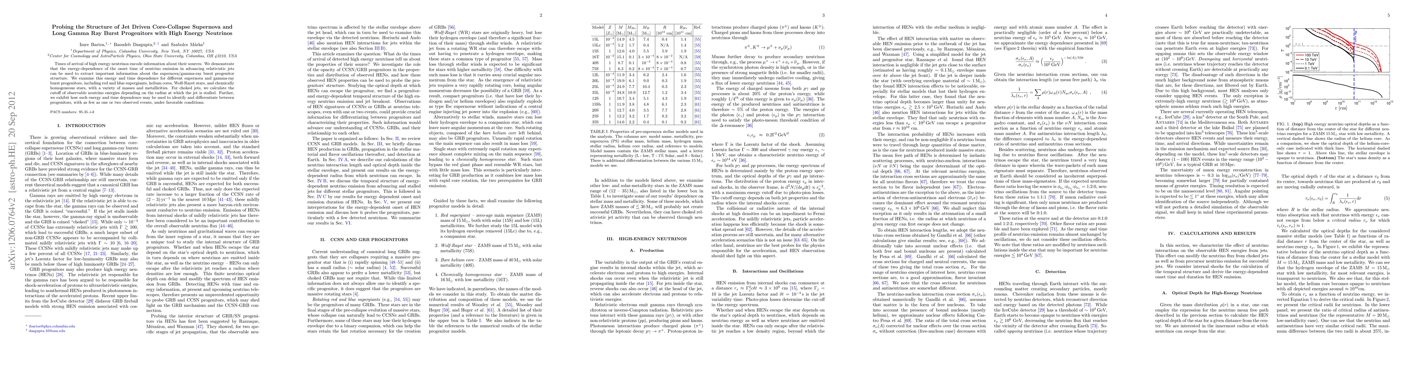 This paper investigates how the timing and energy of high-energy neutrinos from relativistic jets can reveal details about the structure of core-collapse supernova and long gamma-ray burst progenitors. It demonstrates that the energy-dependent onset time of neutrino emission can differentiate between various progenitor types, including different stellar classes and masses.
