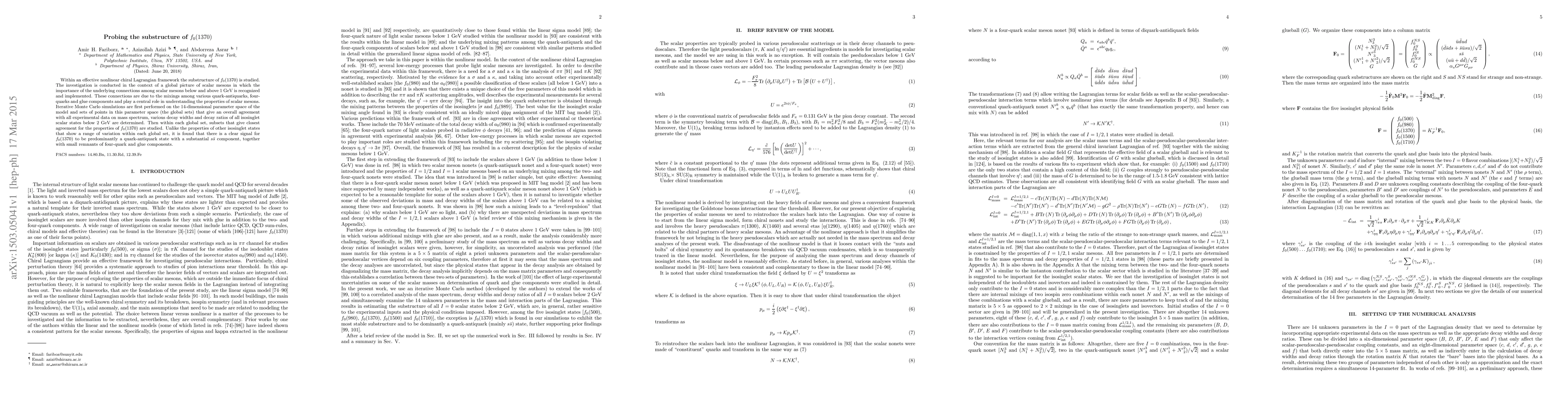Within an effective nonlinear chiral Lagrangian framework the substructure of $f_0(1370)$ is studied. The investigation is conducted in the context of a global picture of scalar mesons in which the importance of the underlying connections among scalar mesons below and above 1 GeV is recognized and implemented. These connections are due to the mixings among various quark-antiquarks, four-quarks and glue components and play a central role in understanding the properties of scalar mesons. Iterative Monte Carlo simulations are first performed on the 14-dimensional parameter space of the model and sets of points in this parameter space (the global sets) that give an overall agreement with all experimental data on mass spectrum, various decay widths and decay ratios of all isosinglet scalar states below 2 GeV are determined. Then within each global set, subsets that give closest agreement for the properties of $f_0(1370)$ are studied. Unlike the properties of other isosinglet states that show a range of variation within each global set, it is found that there is a clear signal for $f_0(1370)$ to be predominantly a quark-antiquark state with a substantial $s {\bar s}$ component, together with small remnants of four-quark and glue components.