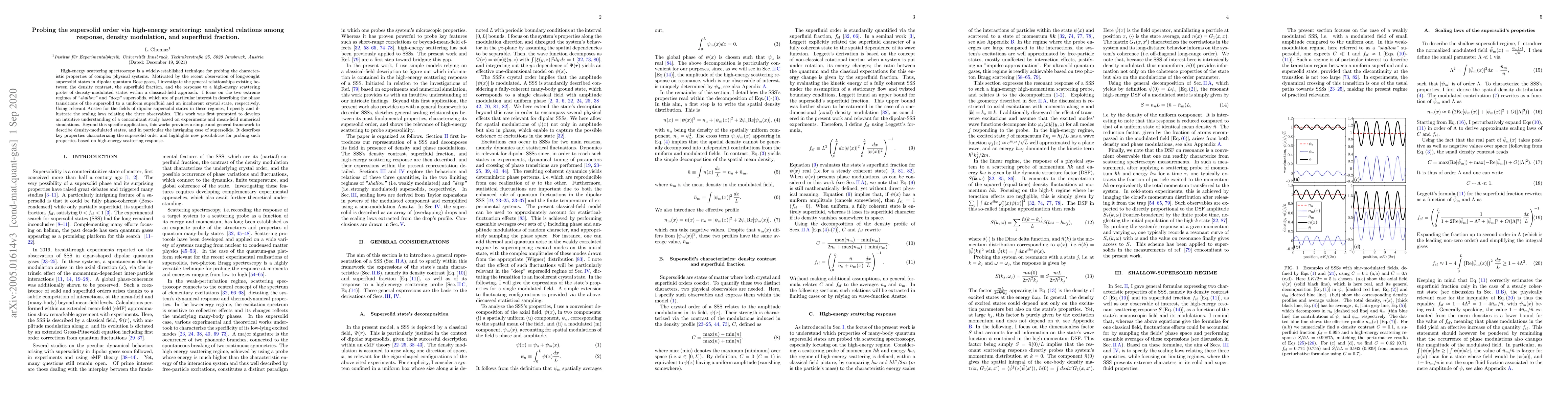 High-energy scattering spectroscopy is a widely-established technique for probing the characteristic properties of complex physical systems. Motivated by the recent observation of long-sought supersolid states in dipolar quantum Bose gases, I investigate the general relationships existing between the density contrast, the superfluid fraction, and the response to a high-energy scattering probe of density-modulated states within a classical-field approach. I focus on the two extreme regimes of "shallow" and "deep" supersolids, which are of particular interest in describing the phase transitions of the supersolid to a uniform superfluid and an incoherent crystal state, respectively. Using relevant Ans\"atze for the fields of dipolar supersolid states in these regimes, I specify and illustrate the scaling laws relating the three observables. This work was first prompted to develop an intuitive understanding of a concomitant study based on experiments and mean-field numerical simulations. Beyond this specific application, this works provides a simple and general framework to describe density-modulated states, and in particular the intriguing case of supersolids. It describes key properties characterizing the supersolid order and highlights new possibilities for probing such properties based on high-energy scattering response.